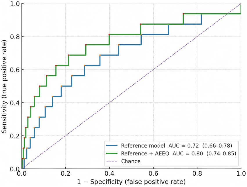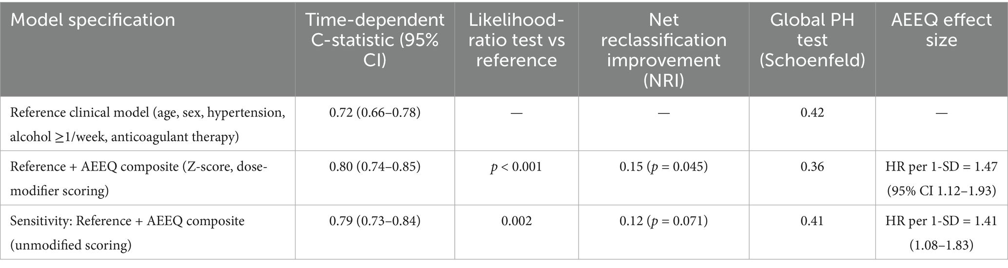 Q1 (lowest exposure) 1/115 (0.9%); Q2 2/115 (1.7%); Q3 3/115 (2.6%); Q4 (highest) 10/115 (8.7%); χ2 trend = 12.95, p = 0.0047. Assuming roughly equal person-time per quartile (~230 person-years each), the corresponding incidence rates were 4.3, 8.7, 13.0, and 43.5 per 1,000 person-years (see Table 9). In multivariable Cox models adjusted a-priori for age, sex, hypertension, alcohol use, and anticoagulant therapy, each 1-SD increase in the AEEQ composite was associated with a 47% higher hazard of cerebral haemorrhage (HR 1.47, 95% CI 1.12–1.93). The time-dependent C-statistic for the reference clinical model was 0.72 (0.66–0.78) and improved to 0.80 (0.74–0.85) after adding the continuous AEEQ Z-score (likelihood-ratio p < 0.001); the net reclassification improvement (NRI) was 0.15 (p = 0.045) (see Table 10; Figure 2). A prespecified drug-exposure interaction was observed: the per-SD AEEQ–haemorrhage association was stronger among participants not using antihypertensives (HR 1.62, 95% CI 1.10–2.39) than among antihypertensive users (HR 1.31, 95% CI 0.95–1.81); interaction p = 0.048. Treating mask use, window-opening and stove-fuel explicitly as dose modifiers within the composite (as per Methods) produced slightly steeper exposure–response slopes than treating them as stand-alone exposures (ΔHR per SD + 0.06).