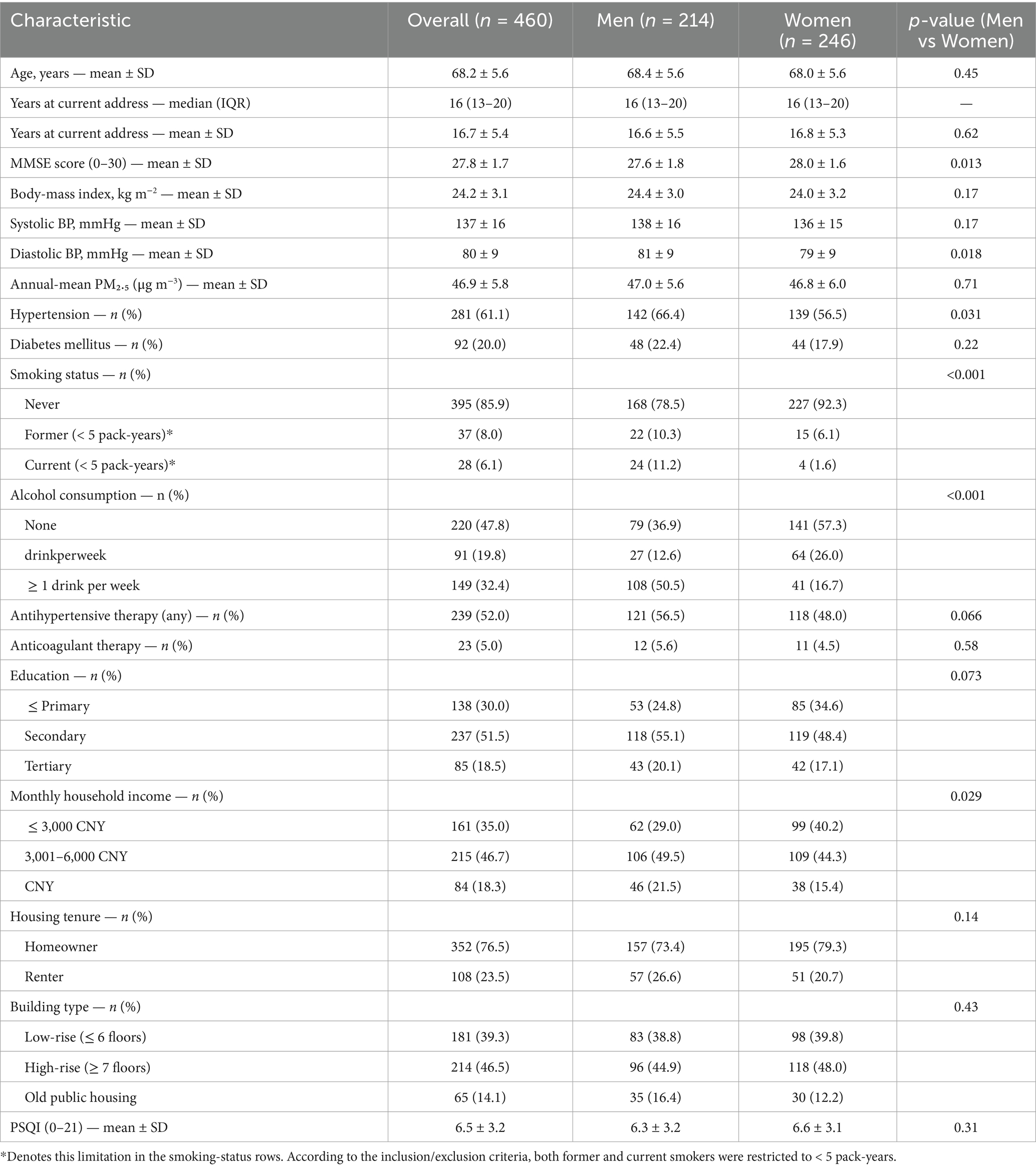 Between 3 January 2022 and 30 April 2024, 4,326 older adults were screened; after applying the revised eligibility criteria (age 60–79 years; continuous ≥ 5 years residence; MMSE ≥ 24; lifetime non-smoker or < 5 pack-years; no prior ischaemic stroke, intracerebral haemorrhage or significant traumatic brain injury; not currently employed in heavy industry/mining; and no change to antihypertensive medication within the preceding 6 months), 460 participants were enrolled and analysed. Median residence duration within Hefei municipality was 16 years (IQR 13–20). Questionnaire completeness was high: < 1% of all items were missing; 3 questionnaires (0.7%) required domain-mean imputation for ≤ 10% of items per the a-priori rule; no questionnaire exceeded the exclusion threshold. Baseline characteristics are summarised in Table 1: mean age 68.2 ± 5.6 years; 214 (46.5%) men; body-mass index 24.2 ± 3.1 kg m−2; hypertension 281 (61.1%); diabetes 92 (20.0%); current smoker 28 (6.1%) (all < 5 pack-years); ≥ 1 alcoholic drink per week 149 (32.4%). Annual-mean residential PM₂.₅ (calendar year prior to baseline) was 46.9 ± 5.8 μg m−3. A total of 239 (52.0%) participants were on long-term antihypertensive therapy at baseline.
