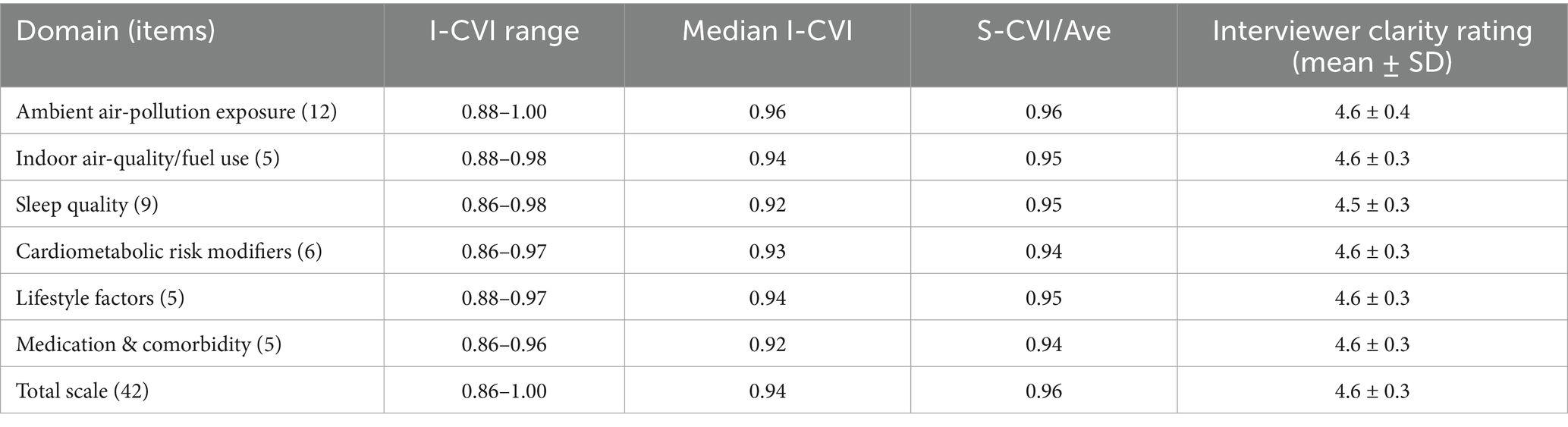 Delphi round-2 appraisal yielded item-level CVIs ranging 0.86–1.00 (median 0.94), with S-CVI/Ave = 0.96, surpassing a-priori thresholds (I-CVI ≥ 0.78; S-CVI/Ave ≥ 0.90). Interviewer global-clarity ratings during cognitive testing averaged 4.6 ± 0.3 on the 5-point scale. Table 2 presents domain-specific indices.
