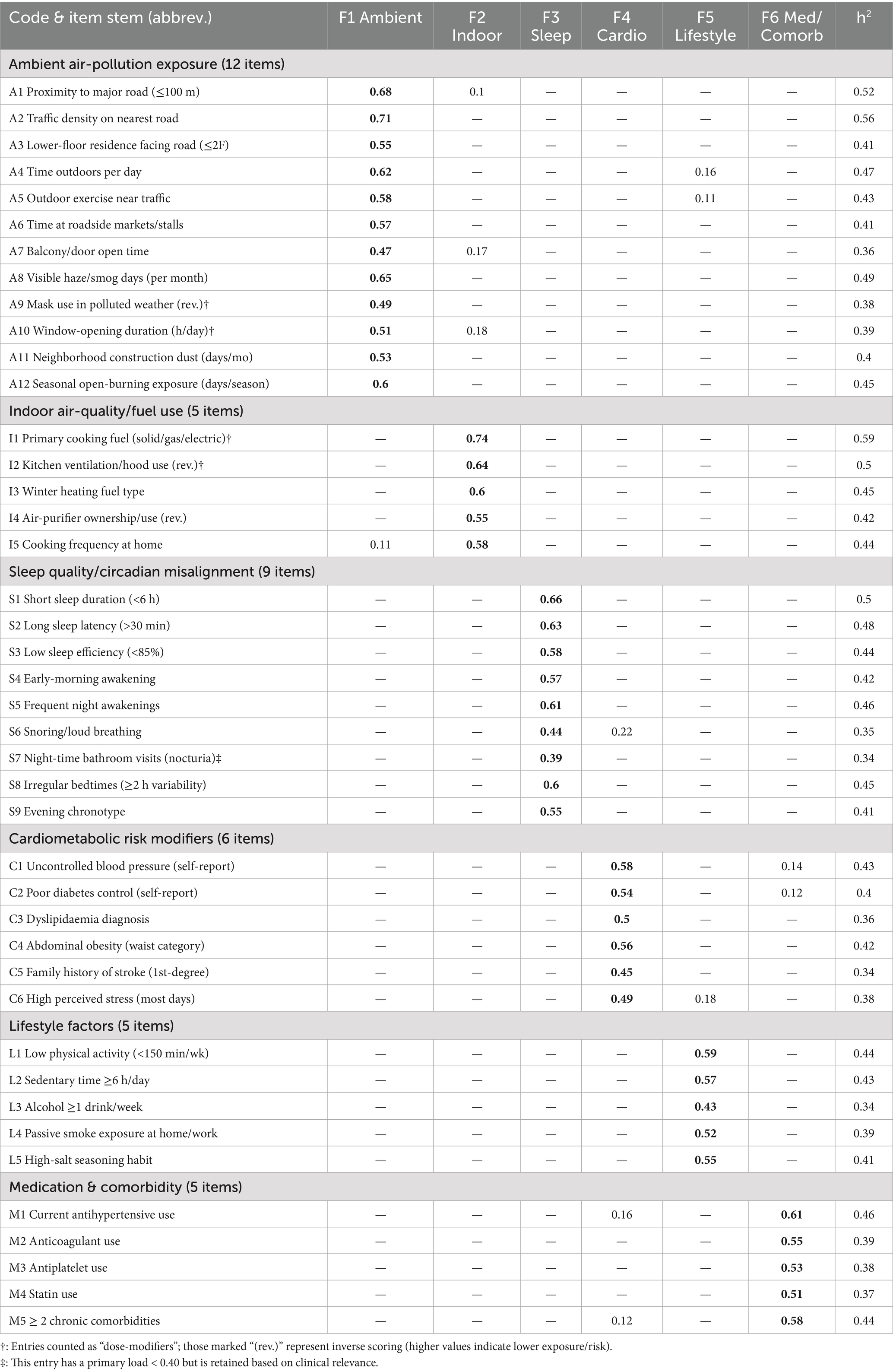 Item generation followed a three-step process. First, an interdisciplinary panel of neurologists, environmental hygienists, and sleep psychologists reviewed international guidelines and PubMed/Embase literature (January 2000 – June 2021) to draft an initial pool of 72 items covering environmental exposure, sleep quality and conventional cerebral-haemorrhage risk modifiers. For this study, environmental exposure was defined a priori as the cumulative (chronic) inhaled burden of ambient and indoor air pollutants over months to years, operationalised by long-term residential conditions and habitual behaviours. The AEEQ therefore prioritises cumulative rather than episodic (acute) exposure: short-term peaks are noted where relevant but the instrument is designed to capture the long-run dose that plausibly contributes to chronic cerebrovascular stress. Second, two modified Delphi rounds involving 15 external experts were conducted; items with a median relevance rating < 4 on a 5-point Likert scale or with an inter-quartile range > 1.5 were dropped. Third, cognitive interviewing with older adults refined wording for comprehension and cultural resonance. The final 42-item Anhui Environmental Exposure Questionnaire (AEEQ) deliberately reflects item-pool parsimony: simulation and pilot timing indicated that approximately 40–45 items balanced respondent burden (~10–12 min) against content breadth across six domains. Retaining materially overlapping items would inflate completion time with minimal gain in construct coverage, whereas reducing the pool below ~35 items risked under-representation of key behavioural modifiers and sleep constructs. Within the ambient-exposure domain, mask use, window-opening habits, and stove-fuel choices were conceptualised as modifiers of pollutant infiltration and effective inhaled dose (e.g., altering indoor/outdoor penetration fraction, source intensity, and personal filtration), not as exposures in their own right; scoring therefore treats these behaviours as dose-attenuating or dose-amplifying features. Sleep items incorporated irregular bedtimes and evening chronotype to operationalise circadian misalignment, a hypothesised mechanism potentiating sympathetic surges and blood-pressure variability that complements the sleep-quality narrative. While a single item probes perceived traffic noise frequency for contextual awareness, the AEEQ does not include a stand-alone noise-exposure module or objective acoustic measurement; this was a pragmatic decision to limit respondent burden and because prior work suggests modest incremental variance after particulate metrics in similar settings—noise will be considered in future iterations.