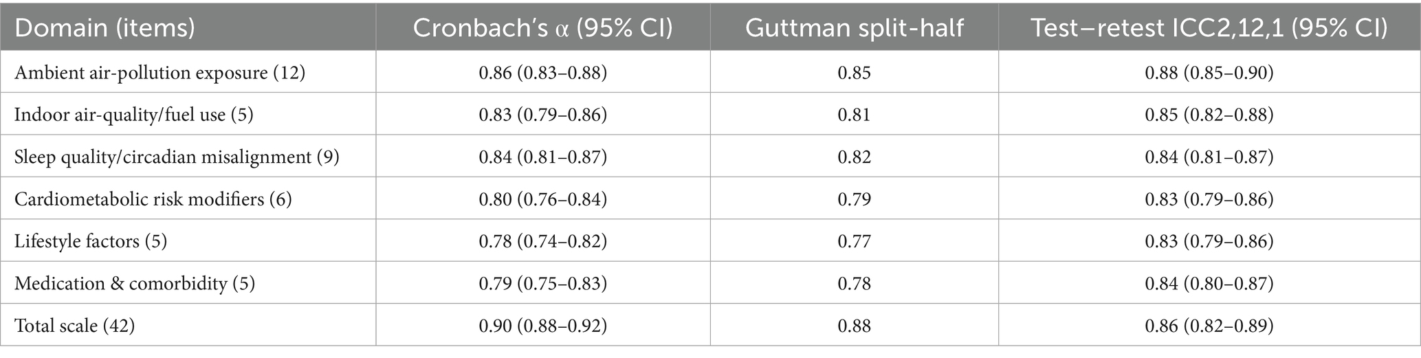 Internal-consistency estimates met or exceeded the a-priori criterion (α ≥ 0.70) for every domain. Cronbach’s α (with 95% bootstrap CIs; 1,000 replications) were: ambient air-pollution 0.86 (0.83–0.88), indoor air-quality/fuel 0.83 (0.79–0.86), sleep quality 0.84 (0.81–0.87), cardiometabolic modifiers 0.80 (0.76–0.84), lifestyle 0.78 (0.74–0.82), medication/comorbidity 0.79 (0.75–0.83); total scale 0.90 (0.88–0.92). Guttman split-half coefficients paralleled these values (0.77–0.87; total 0.88). In the 14 ± 3-day retest subsample (n = 212), two-way mixed-effects ICCs indicated good-to-excellent stability: domains 0.83–0.88; total scale 0.86 (0.82–0.89). Details appear in Table 7.