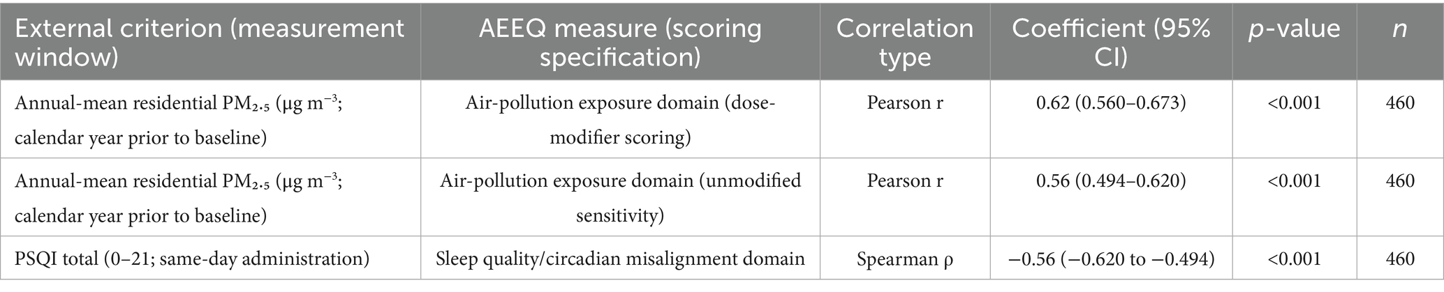 As prespecified, the AEEQ air-pollution exposure domain correlated strongly with annual-mean residential PM₂.₅ (Pearson r = 0.62, 95% CI 0.560–0.673, p < 0.001), and the sleep-quality domain correlated inversely with PSQI (Spearman ρ = −0.56, 95% CI − 0.620 to −0.494, p < 0.001). Using the dose-modifier specification (mask use, window-opening, stove-fuel) embedded in scoring improved the air-pollution domain’s correlation with PM₂.₅ by Δr = 0.06 relative to an unmodified specification. Criterion-validity coefficients are summarised in Table 8.