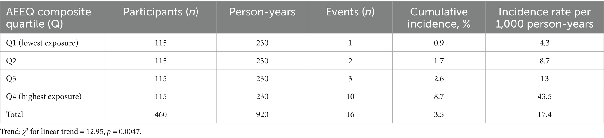 Table 9. Incident cerebral haemorrhage by baseline AEEQ quartile: counts, person-time and rates (analytic cohort n = 460; follow-up ≈ 24 months).