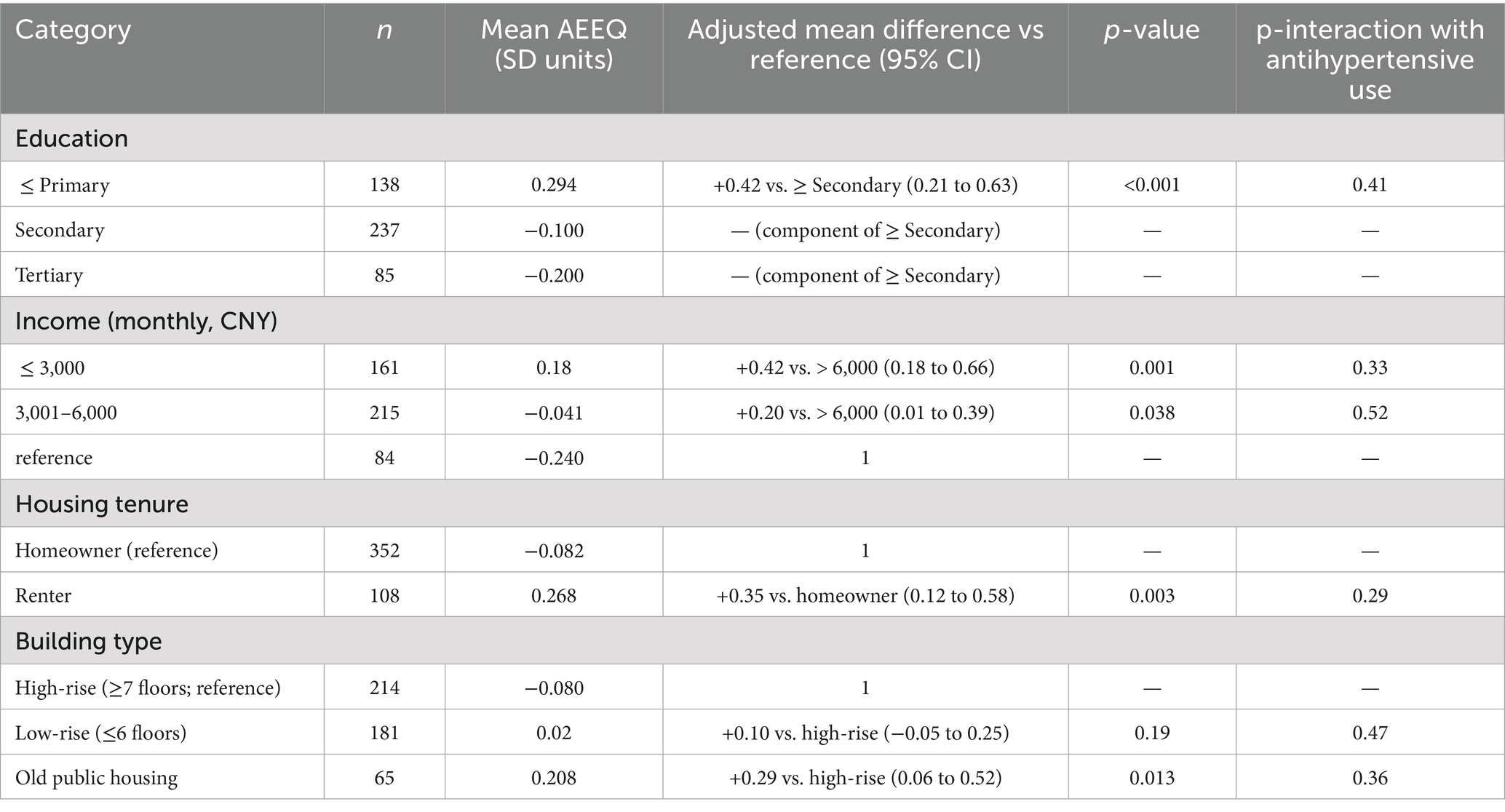 Findings were unchanged after excluding the 3 participants with domain-level imputation (HR per SD = 1.49, 95% CI 1.13–1.96), and when the AEEQ was modelled as tertiles rather than quartiles (tertile-3 vs. tertile-1 adjusted HR = 2.71, 95% CI 1.09–6.72; p-trend = 0.008). Proportional-hazards assumptions were not violated (global Schoenfeld p = 0.36). To address environmental inequity, we profiled AEEQ distributions by socio-economic position and housing type. Participants in the lowest education stratum (≤ primary) had higher mean AEEQ composites than those with ≥ secondary education (mean difference 0.42 SD, 95% CI 0.21–0.63), and renters exceeded homeowners by 0.35 SD (95% CI 0.12–0.58). In a mutually adjusted model, both education and tenancy remained independent correlates of higher AEEQ (both p < 0.01). Results are detailed in Table 11. Because noise exposure was not measured as a stand-alone module in this iteration (per Methods), the single traffic-noise item served only contextual purposes; it correlated moderately with the ambient domain (r = 0.41) but did not materially improve fit indices or predictive performance when added (ΔCFI +0.002; ΔAUC +0.003).