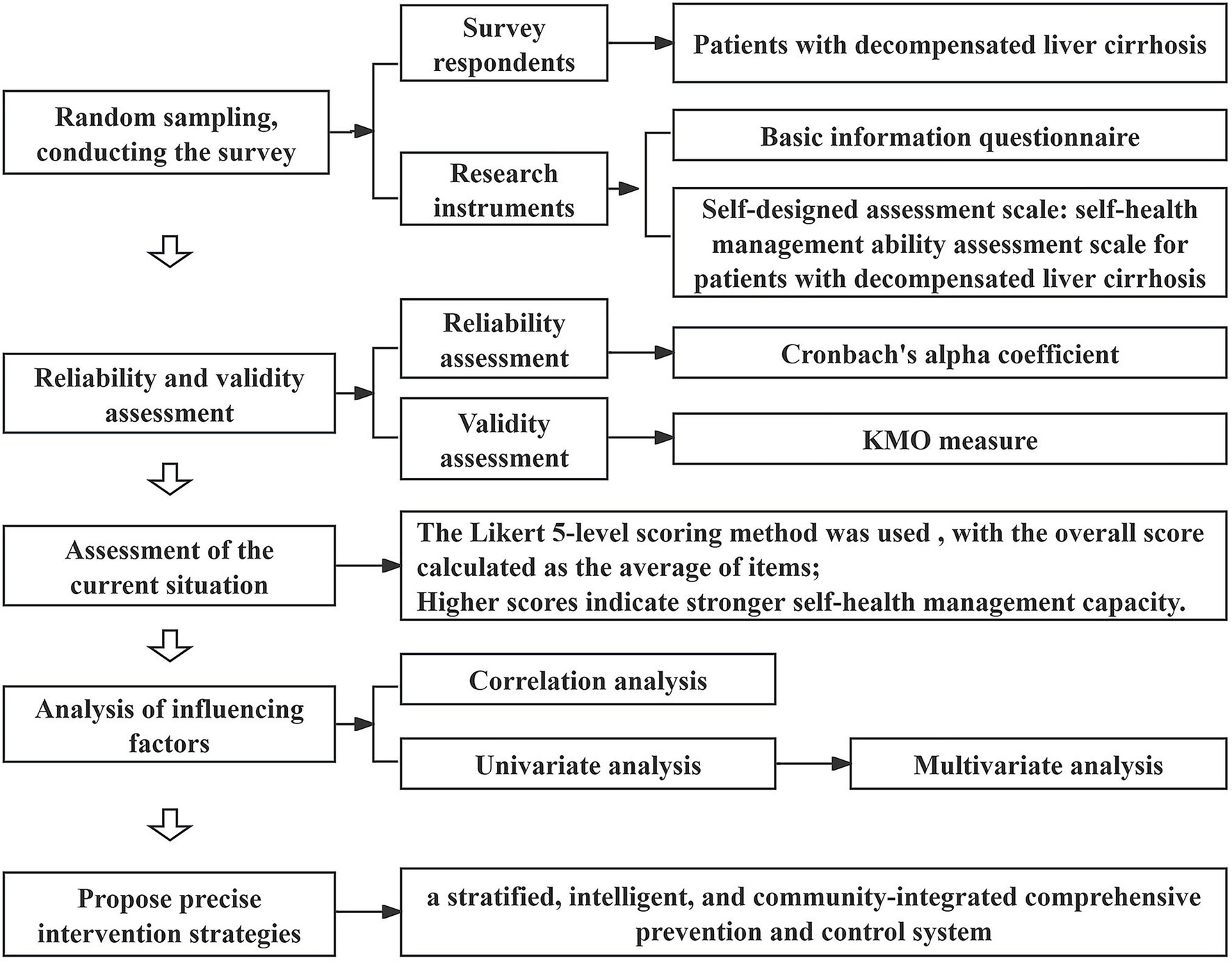 To address this, this study employs a self-developed “Self-Health Management Ability Assessment Scale for Patients with DLC” to evaluate patients with DLC admitted to Shanxi Provincial People’s Hospital in Shanxi Province, China. The objectives are to validate the scale’s feasibility, identify key determinants affecting patients’ self-health management capacity, and propose targeted intervention strategies based on the findings, thereby providing evidence for personalized health management and precise clinical interventions. A schematic diagram of the research is shown in Figure 1.