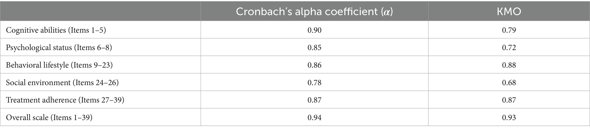 The construct validity assessment shows a KMO measure of 0.93 for the total scale; the KMO values for individual primary dimensions range from 0.68 to 0.88 (Table 1), indicating that the scale is suitable for factor analysis.