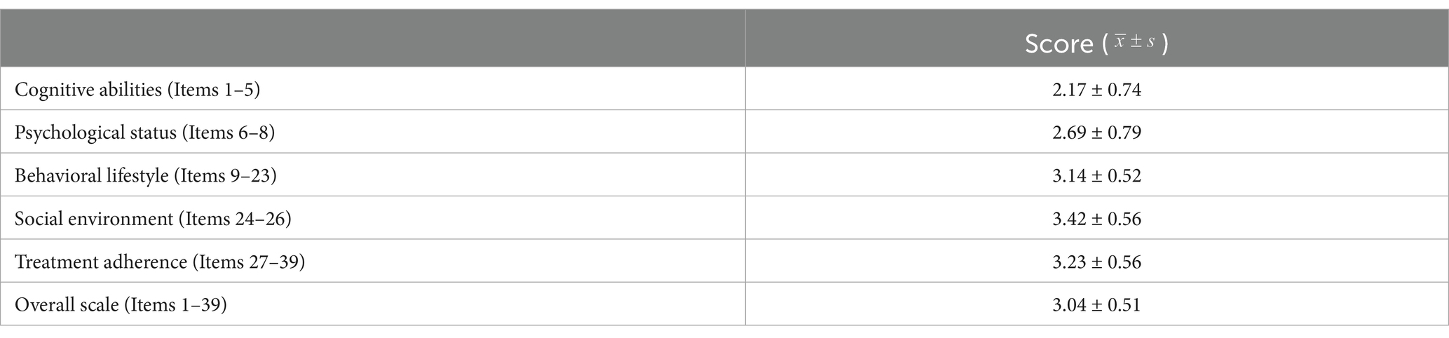 The survey results (Table 2) indicate that the overall self-management ability score among patients with DLC in Shanxi Province is 3.04 ± 0.51 out of 5. The domain scores, ranked from highest to lowest, are as follows: social environment (3.42 ± 0.56), treatment adherence (3.23 ± 0.56), behavioral lifestyle (3.14 ± 0.52), psychological status (2.69 ± 0.79), and cognitive ability (2.17 ± 0.74).