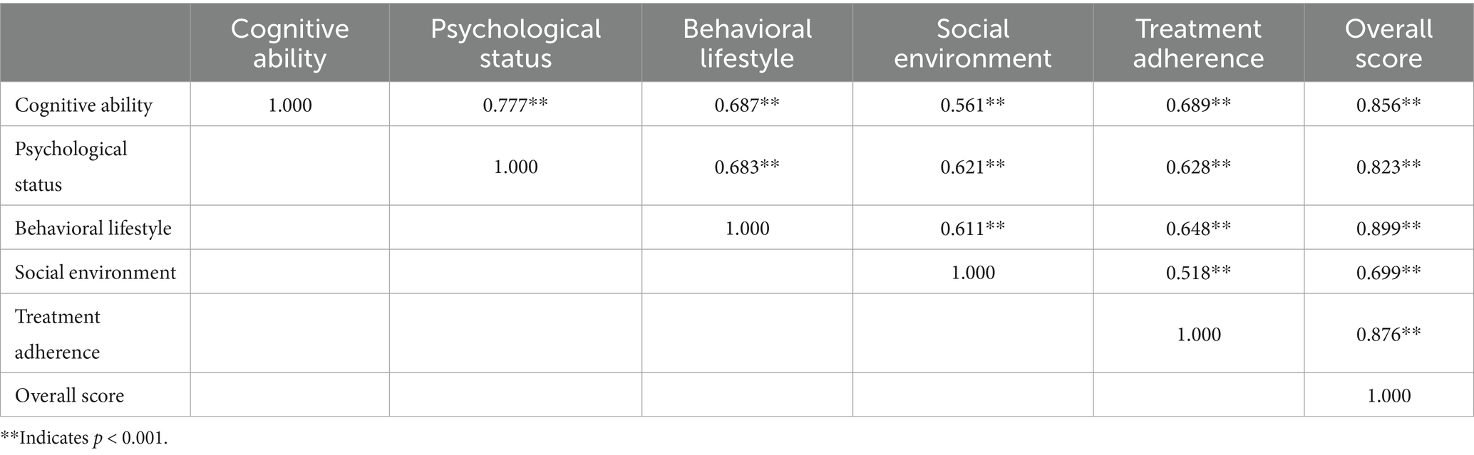 (2) Inter-domain correlations: cognitive ability correlates strongly with psychological status, behavioral lifestyle, and treatment adherence (0.6 < r ≤ 0.8). Psychological status correlates strongly with behavioral lifestyle, social environment, and treatment adherence (0.6 < r ≤ 0.8). Behavioral lifestyle correlates strongly with social environment and treatment adherence (0.6 < r ≤ 0.8).