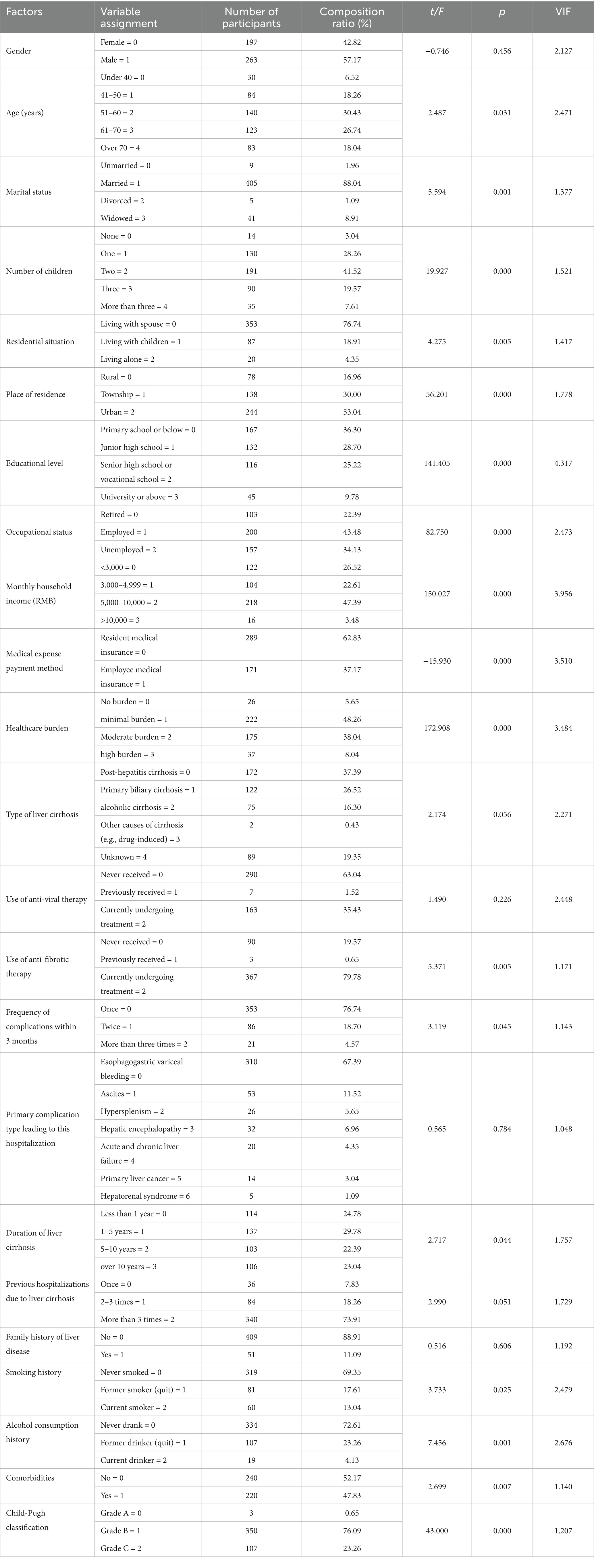When the dependent variable is continuous, linear regression analysis is typically employed to examine the association between independent and dependent variables. Patient characteristics and univariate analysis of self-health management ability in DLC are presented in Table 4. Among them, 263 cases were male (57.2%), and 197 cases were female (42.8%). The findings indicate that self-management levels are significantly correlated with age, marital status, number of children, residential situation, place of residence, educational level, occupational status, monthly household income, medical expense payment method, healthcare burden, whether anti-fibrotic therapy is administered, frequency of complications within 3 months, duration of liver cirrhosis, smoking history, alcohol consumption history, comorbidities, and Child-Pugh classification (p < 0.05). The variance inflation factor (VIF) values for all variables were all below 5 (ranging from 1.048 to 4.317), suggesting the absence of severe multicollinearity issues.