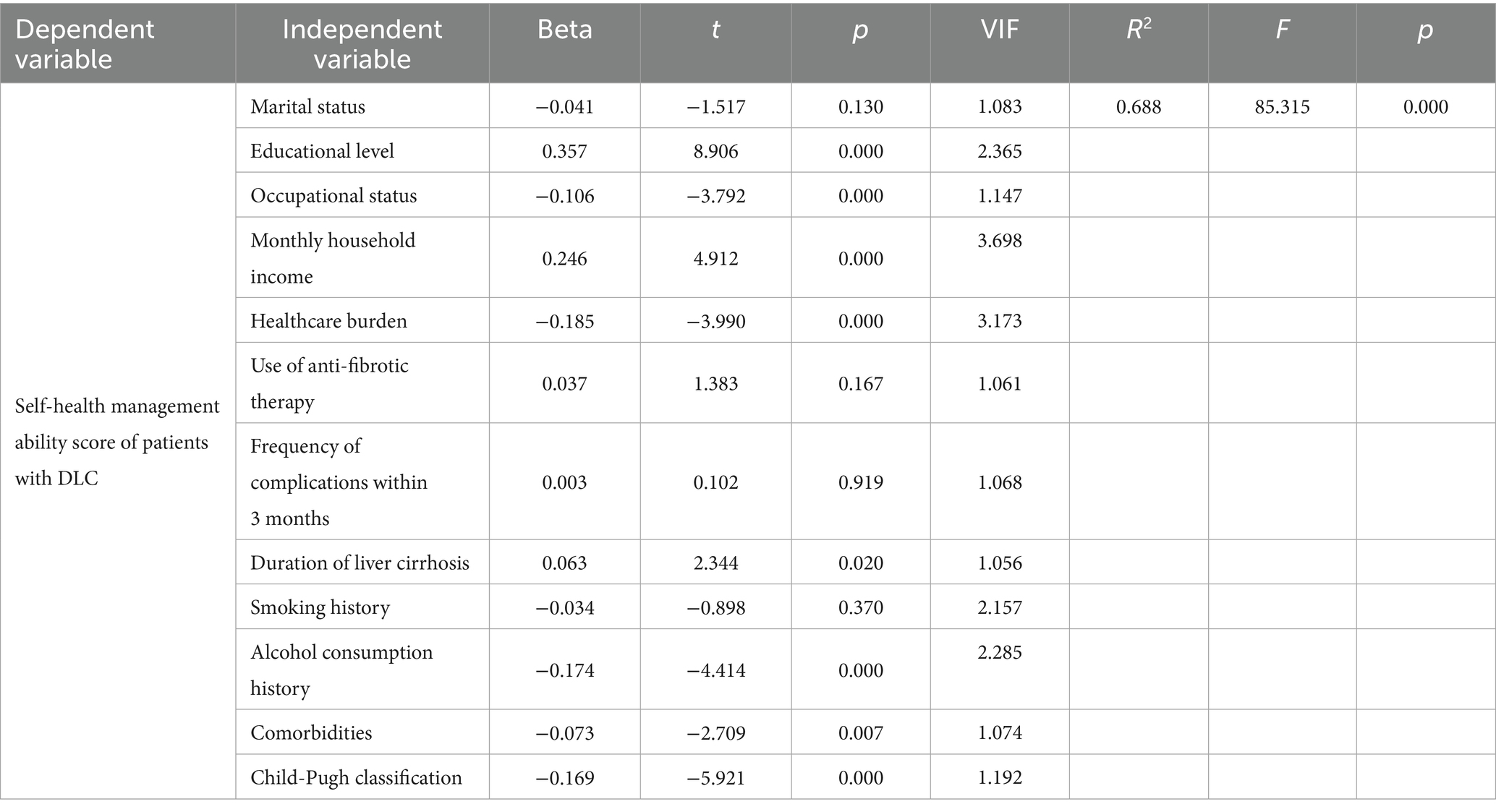 Results from the multivariate regression indicate that educational level, occupational status, monthly household income, healthcare burden, duration of liver cirrhosis, alcohol consumption history, comorbidities, and Child-Pugh classification are significant factors affecting self-health management capacity in DLC patients in Shanxi Province (p < 0.05). Specifically, higher educational levels, greater household income, and longer disease duration are positively correlated with self-management scores (positive Beta coefficients). Conversely, occupational status, healthcare burden, alcohol use history, comorbidities, and Child-Pugh grades are negatively correlated with self-health management capacity (negative Beta coefficients).