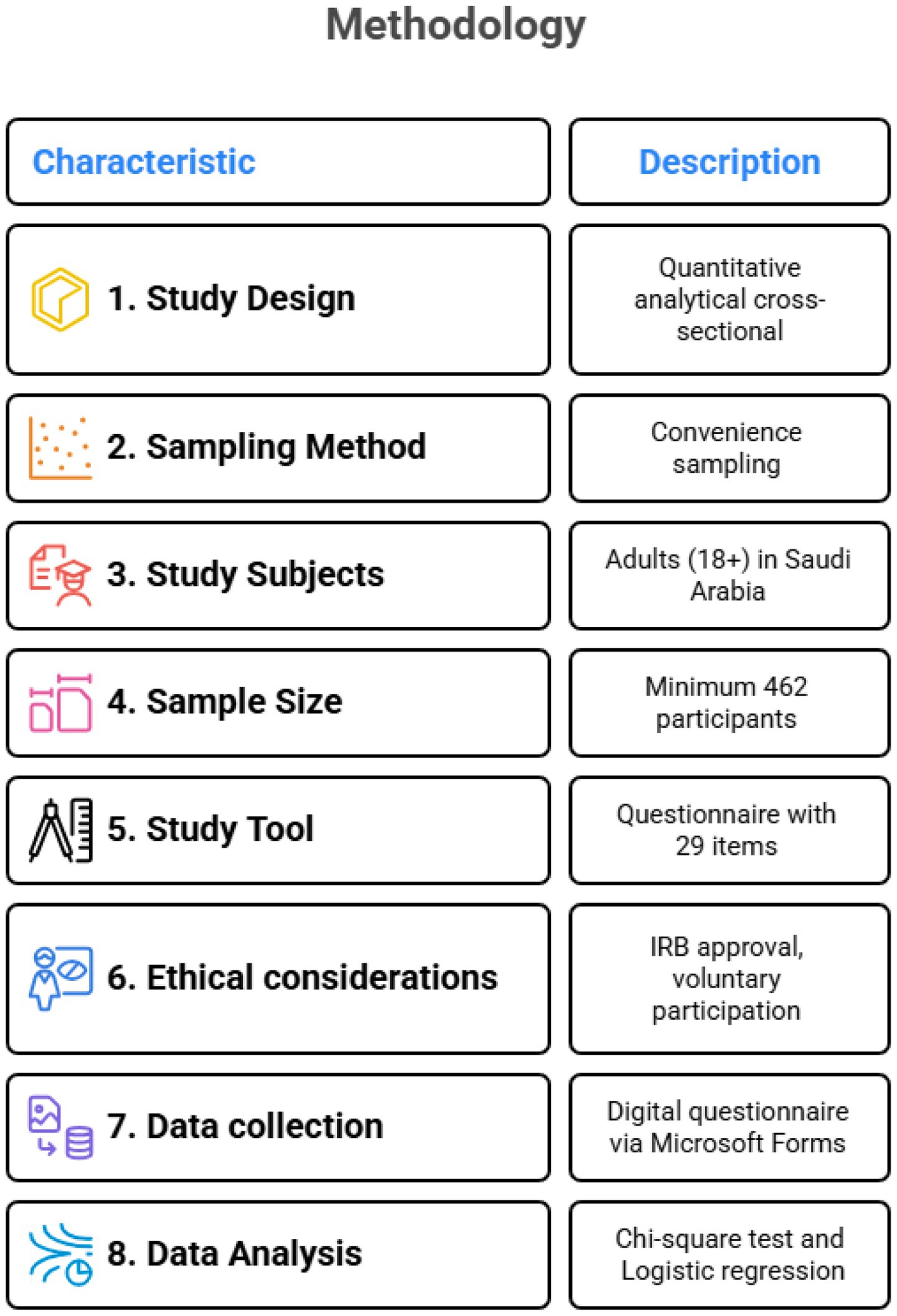 This quantitative analytical cross-sectional study was conducted through a survey- based questionnaire over a period of 6 months, from November 2024 to April 2025. The target population for this study consisted of adults residing in the major cities from different regions of Saudi Arabia.