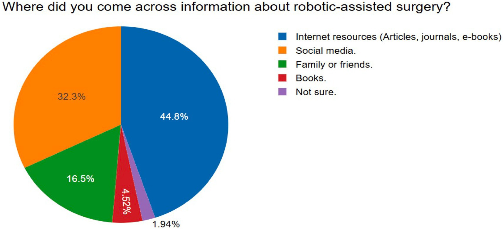 The pie chart illustrates the distribution of sources through which respondents reported acquiring information about robotic-assisted surgery (Figure 2). The majority of participants (44.8%) indicated that they obtained information from internet-based resources, including articles, journals, and e-books. Social media was identified as the second most prevalent source, accounting for 32.3% of responses. Information from family or friends constituted 16.5% of the total, while a smaller proportion of respondents cited books (4.52%) as their source. A minority (1.94%) reported being unsure of where they had encountered information on the topic.