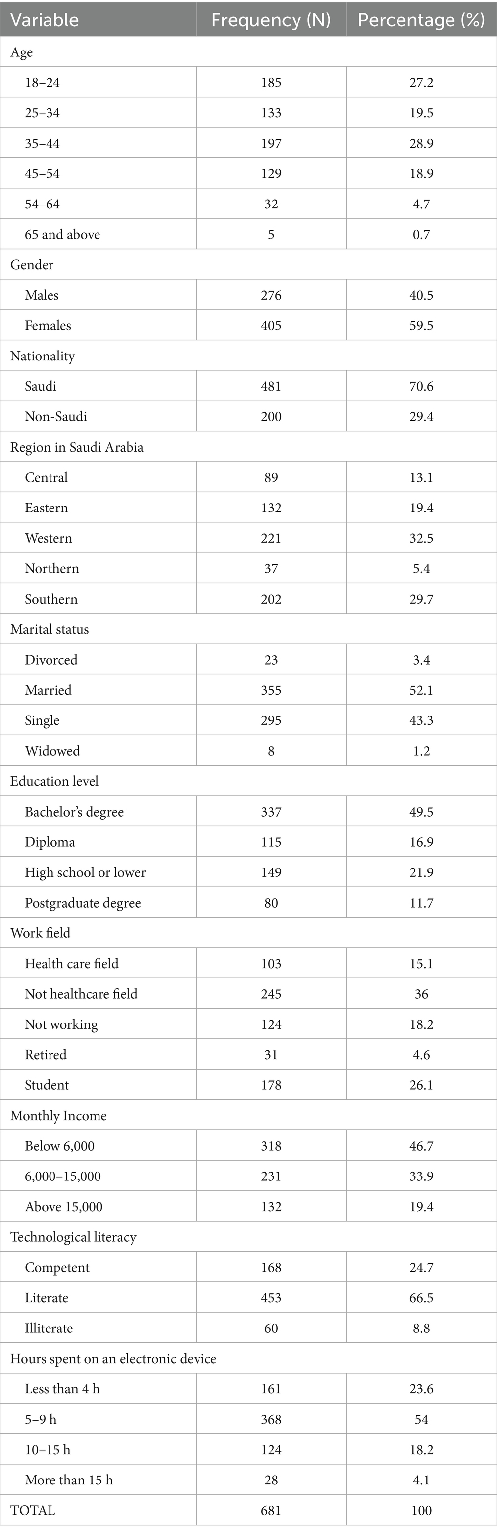 A total of 681 participants were included in this study. The largest age group was 35–44 years (28.9%), while only a small percentage (0.7%) were 65 years or older as shown in Table 1. More females (59.5%) participated than males (40.5%). A majority of the participants were Saudi nationals (70.6%), with most living in the Western (32.5%) and Southern (29.7%) regions of Saudi Arabia. More than half of the participants (52.1%) were married, and nearly half (49.5%) held a bachelor’s degree. In terms of employment, 36.0% worked outside the healthcare field, while 26.1% were students. Most participants (66.5%) were considered technologically literate, and the majority (54.0%) spent 5–9 h per day using electronic devices.