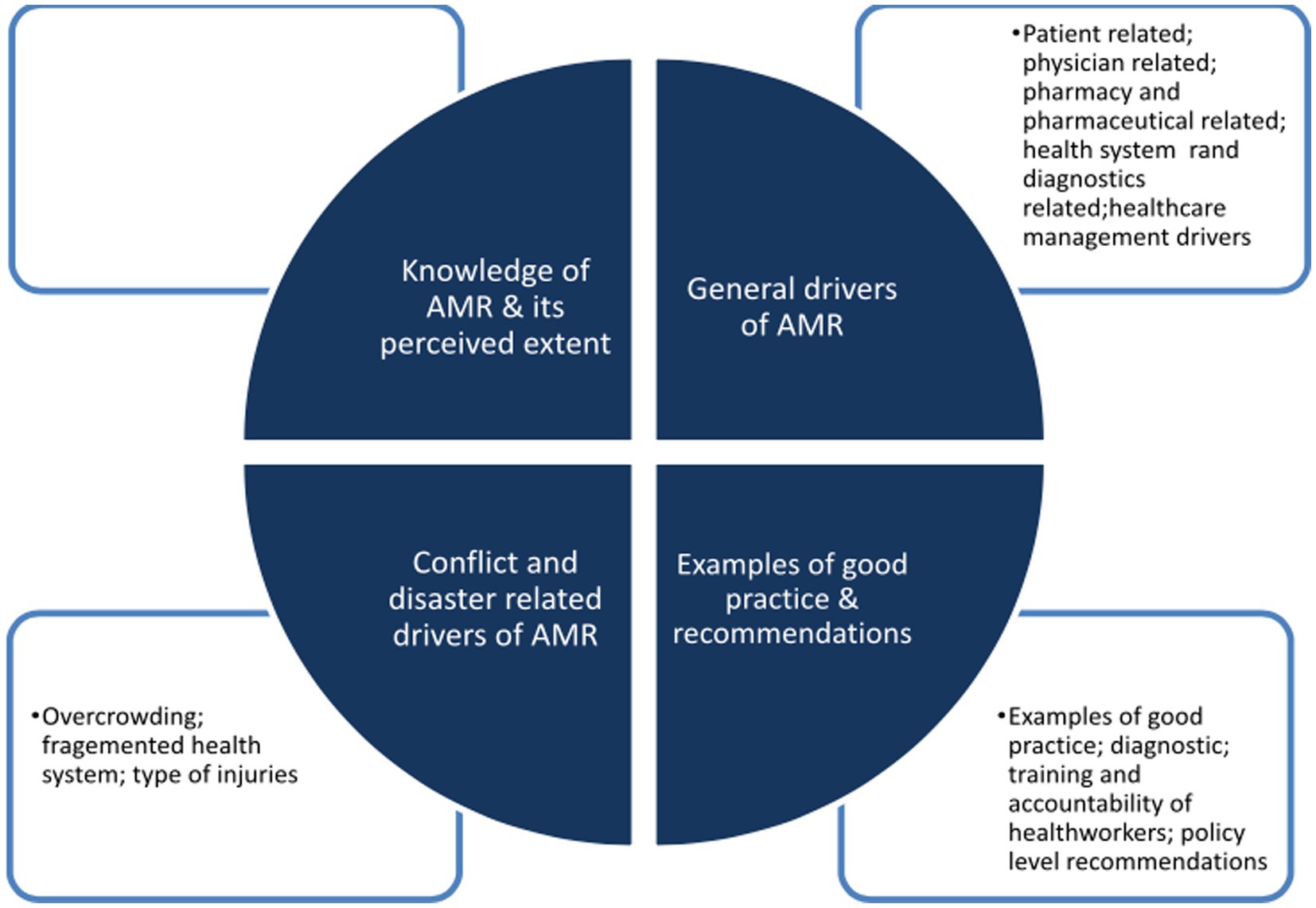 Results: Of the 17 key informants, (11 doctors, 6 pharmacists); most were from Idlib governorate. Emerging themes included healthcare professionals’ understanding of AMR, perceived drivers, conflict- and disaster-related influences, and examples of good practice. Frequently cited drivers of AMR were over-the-counter availability of antimicrobials, pharmacy-led dispensing, and community insistence on antibiotics. Inadequate microbiology diagnostic capacity was also highlighted as a key factor.