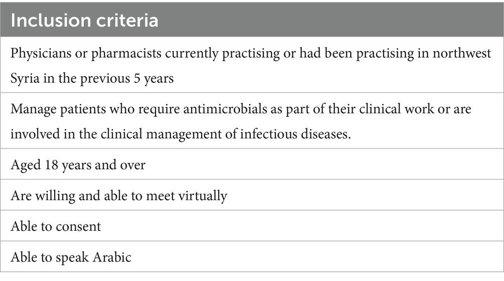 In this exploratory, qualitative research, we focused on the perspectives of doctors and pharmacists, the two main groups involved in prescribing and dispensing antibiotics in the former northwest of Syria. We used a combination of purposive and snowball sampling to identify physicians and pharmacists who fulfilled the inclusion criteria (see Table 1). Initial participants were identified through the Syrian Board of Medical Specialties (SBOMS) and Syria Public Health Network (SPHN) and the contacts of authors. Specifically, we shared information about the study in a WhatsApp group with senior SBOMS staff, who then nominated the first group of participants from their network, who met the inclusion criteria.