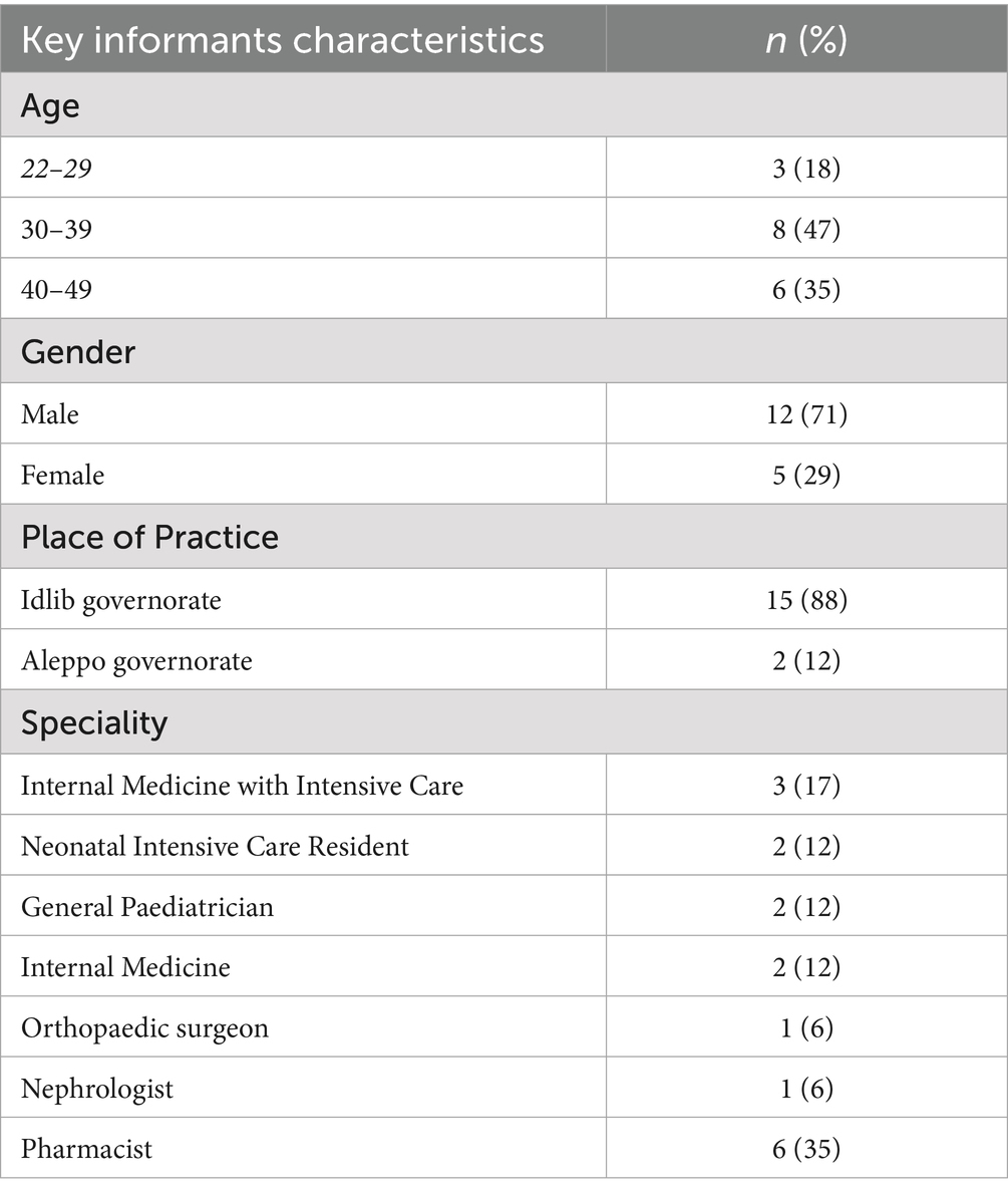 Of the 17, 12 were male and five were female. Eleven were physicians and six were pharmacists; 15 of them were practicing in Idlib governorate at the time of the interview. Table 2 has more details of the participants.