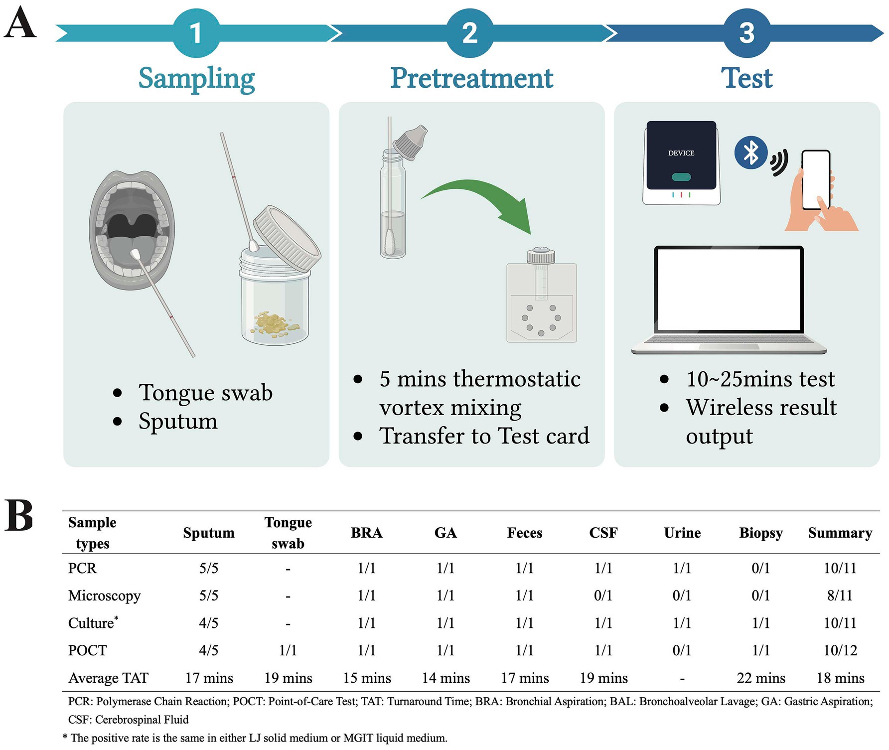 Tuberculosis (TB) remains one of the most pressing global public health threats, with the World Health Organization (WHO) reporting an annual incidence of over 11 million cases worldwide (1). As the leading infectious disease killer, TB claims approximately 1.3 million lives each year, surpassing even HIV/AIDS and malaria in mortality rates (2). A particularly alarming issue is that nearly 30% of TB cases are undiagnosed, which makes them a potential source of infection on the move (1, 2). This diagnostic gap not only leads to treatment delay but also increases the risk of transmission, especially in high-burden regions with limited healthcare access. Accurate and rapid diagnosis is the key to achieving the WHO’s “End TB strategy,” which aims to reduce 95% of TB deaths by 2035. Point-of-care tests (POCTs) enable immediate detection at the community level, offer the chance of early intervention, curb further spread, and simultaneously decrease the risk of TB transmission (3). However, developing an ideal POCT that fully complies with the Affordable, Sensitive, Specific, User-friendly, Rapid and robust, Equipment-free and Deliverable to end-users (ASSURED) criteria defined by WHO is still challenging. Current diagnostic tools often fall short due to technical complexity, infrastructure requirements, or high costs. This study aimed to test the performance of a POCT for tuberculosis diagnosis with a simple procedure, portable device, and reasonable price.