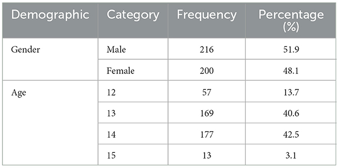 Table 1 presents the demographic characteristics of the respondents, including gender and age distribution. Descriptive statistics, specifically frequencies and percentages, were employed to analyze the participants' profiles. As indicated in Table 1, the sample comprised 216 male students (51.9%) and 200 female students (48.1%). Regarding age distribution, 57 students (13.7%) were 12 years old, 169 students (40.6%) were 13 years old, 177 students (42.5%) were 14 years old, and 13 students (3.2%) were 15 years old.