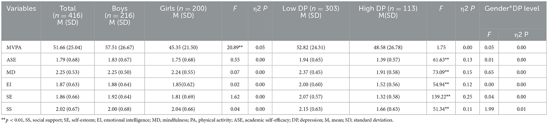 Among our various data distributions, skewness and kurtosis ranged from −0.807 to 0.379 and −0.616 to 0.843, suggesting that all variables were approximately normally distributed. The MANOVA model for psychological variables revealed a significant main effect of depression (Wilks' Lambda = 0.326, F = 104.54, p < 0.001, η2 = 0.674). Compared to high depression, low depression reported significantly higher levels of ASE (M = 1.94 vs. M = 1.39, η2 = 0.13), MD (M = 2.37 vs. M = 1.91, η2 = 0.15), EI (M = 2.00 vs. M = 1.52, η2 =0.12), SE (M = 2.07 vs. M = 1.32, η2 = 0.25), SS (M = 2.15 vs. M = 1.66, η2 = 0.05). The effect sizes η2 (partial eta squared) ranged from 0.11 to 0.25, indicating medium to large effects of depression levels on psychological variables (36). But the depression levels showed no significant difference in MVPA, F(1, 414) = 1.75, p > 0.05, η2 = 0.00. The MANOVA model for gender revealed that there was a significant gender difference in MVPA, with boys (M = 57.51, SD = 26.67) reporting higher levels of PA than girls (M = 45.35, SD = 21.50), F(1, 414) = 20.89, p < 0.01, η2 = 0.05. This indicated a small but significant effect of gender on PA. For ASE, MD, EM, SE, and SS, no significant differences were found between boys and girls (p > 0.05). This suggested that gender did not play a significant role in these psychological variables. The MANOVA model for interaction effects (gender*depression level) showed no significant interaction effects were found between gender and depression levels for any of the variables, including MVPA and psychological outcomes (p > 0.05). This suggested that the impact of depression on psychological and PA is consistent across genders (Table 2).