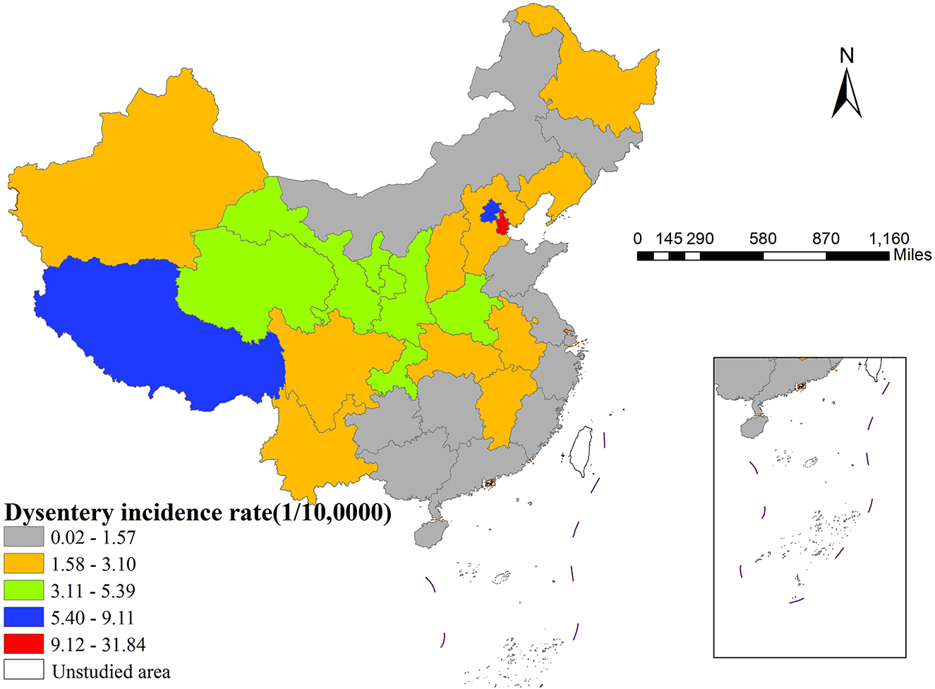 The study first employed Geographic Information System spatial visualization techniques to construct a thematic map of dysentery incidence across 31 provincial-level administrative regions in mainland China. By transforming provincial incidence data into intuitive spatial distribution maps, the regional variations in disease incidence intensity were clearly presented.