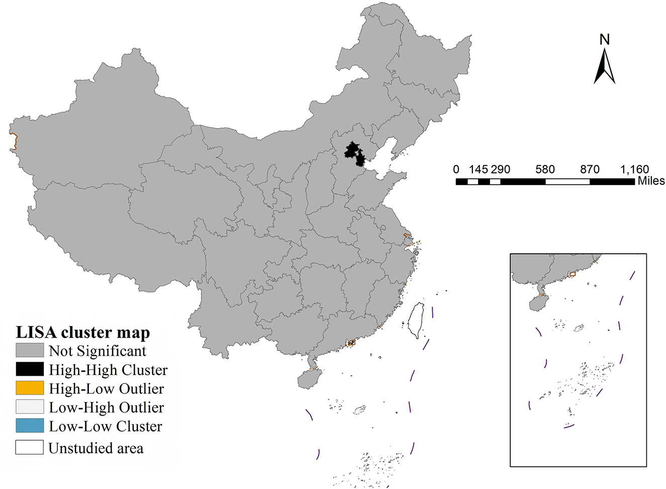 The Local Indicators of Spatial Association (LISA) method was applied to examine spatial correlation patterns between provincial administrative regions and their neighboring areas. Using the same variable definitions as the global Moran's I, The computational formula is expressed as (Equation 2) (26):
