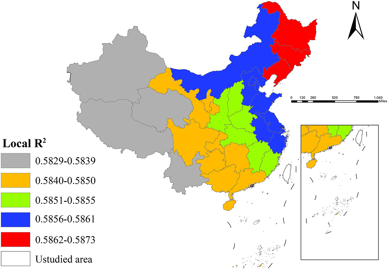 Further spatial analysis indicated superior model fit in eastern regions (e.g., northeastern provinces, Beijing, Tianjin), where local R2 values were generally higher, suggesting strong explanatory power of selected variables for incidence variation. However, the model showed relatively poorer performance in western provinces (e.g., Yunnan, Tibet), implying potential needs for incorporating additional influencing factors to enhance explanatory capability in these areas (Figure 6).