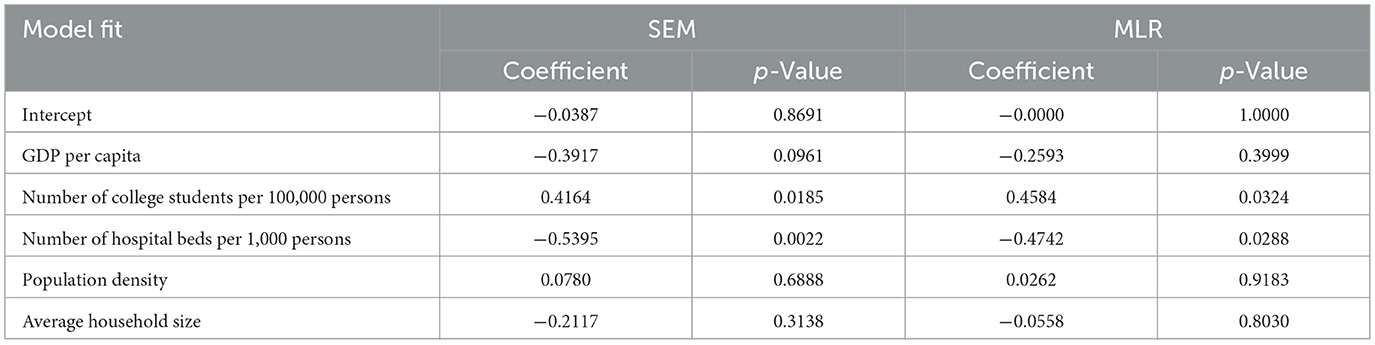 After controlling for spatial effects, both the number of college students per 100,000 persons and the number of hospital beds per 1,000 persons remained statistically significant (p < 0.05), with their significance further enhanced compared to MLR (Table 2). Model comparisons revealed that the SEM exhibited improved R2, higher log-likelihood values, and lower AIC, confirming its superiority (Table 3).