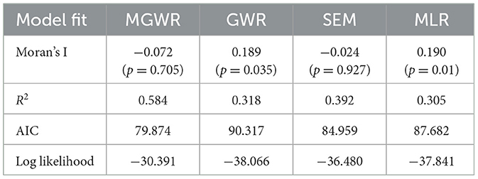 Where each explanatory variable xik corresponds to an independent bandwidth parameter bwk. This design enables more accurate capture of spatial heterogeneity in each variable's influence range. For parameter estimation, MGWR employs an iterative back-fitting algorithm for optimization, determines optimal bandwidth combinations through CV criteria, and constructs spatial weight matrices based on Gaussian kernel functions (32). Compared with conventional GWR, key advantages of MGWR include: (1) effectively addressing parameter estimation bias caused by single bandwidth through variable-specific bandwidth settings; (2) precisely identifying differential spatial influence ranges among explanatory variables; and (3) significantly improving model accuracy in analyzing complex spatial dependence relationships. These characteristics establish MGWR as a more reliable and precise methodological tool for spatial heterogeneity analysis, particularly suitable for research scenarios where explanatory variables exhibit varying spatial scales of influence.