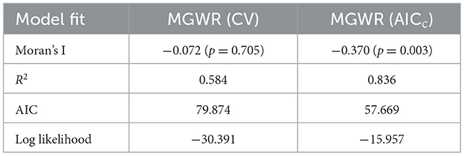 The sensitivity analysis revealed that bandwidth selection critically influenced MGWR model outcomes. Comparative evaluation of MGWR models constructed under AICc and CV criteria (Table 4) showed that while the AICc-based model achieved slightly better goodness-of-fit, its residuals still exhibited significant spatial autocorrelation. Therefore, the CV-based MGWR model demonstrated better robustness and proved more suitable for this study's data analysis.