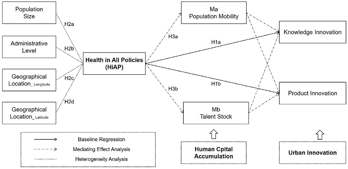 As mentioned above, the impact of HiAP on urban innovation is currently ambiguous. The complexity of this relationship stems from the absence of a straightforward direct connection between HiAP and urban innovation. Rather, HiAP often necessitates conversion into specific forms of human capital, which are linked to urban innovation. While various studies have started to investigate mediating factors, the role of human capital as a mediator in translating policy effects into urban innovation has been widely acknowledged. Nonetheless, limited research has approached this issue through the lens of Health in All Policies. For instance, human capital can act as a mediating factor in areas such as public service provision, the promotion of civilized cities, and the implementation of new urbanization initiatives, thereby impacting cities' innovation capabilities (13). Further exploration is warranted to delve into the mediating effect of human capital accumulation on the relationship between HiAP and urban innovation. The theoretical model for this study is illustrated in Figure 1.