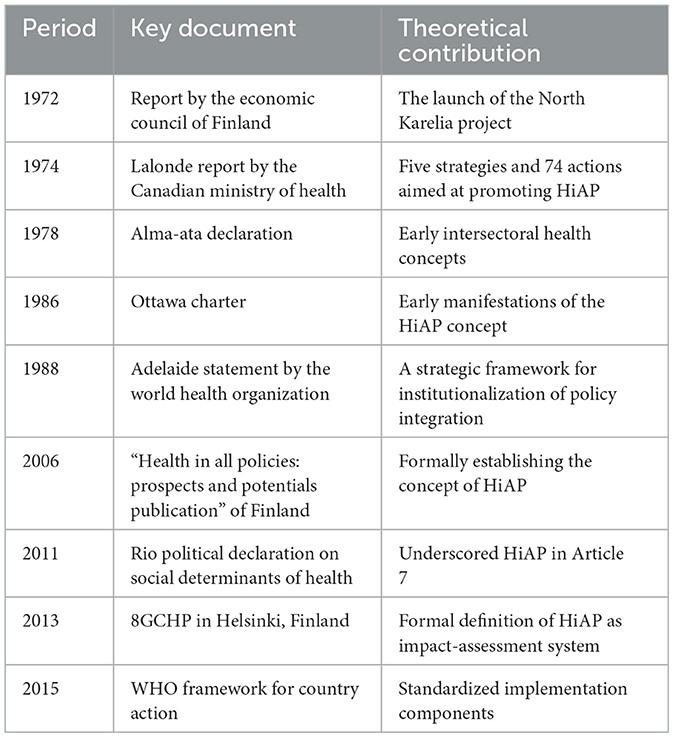 The origins of HiAP can be traced back to the nineteenth-century public health movement (6). Early expressions of the concept appeared in the Alma-Ata Declaration (76) and the Ottawa Charter (77), which underscored the significance of social determinants of health, conducive environments for health promotion, and cross-sectoral collaboration. The 1988 Adelaide Statement by the World Health Organization introduced a strategic framework for governments to incorporate health considerations into policy planning. In 2006, HiAP was formally introduced as a distinct policy framework, with the goal of integrating health considerations into all policies through intersectoral collaboration to enhance population health and health equity (7). Another pivotal moment in the advancement of the HiAP concept occurred during the 8th Global Conference on Health Promotion (8GCHP) in Helsinki, Finland, in 2013. At this event, definitions and frameworks pertaining to HiAP were introduced. In 2015, the World Health Assembly endorsed the WHO Framework for Country Action on Intersectoral Action for Health and Health Equity, which articulated the essential components for implementing HiAP. Table 1 summarizes the conceptual evolution of HiAP. Importantly, HiAP extends far beyond healthcare policy, embedding health considerations across the entire economy—a feature that is central to its impact on innovation.