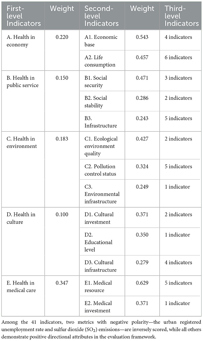 What's more, the weights of each indicator were determined by expert meeting method. According to the annual report on urban health life in China (71), more than 20 experts from relevant fields were invited. After the first round of scoring, the average weight was fed back for the second round of scoring. After three rounds, the weights tended to stabilize.