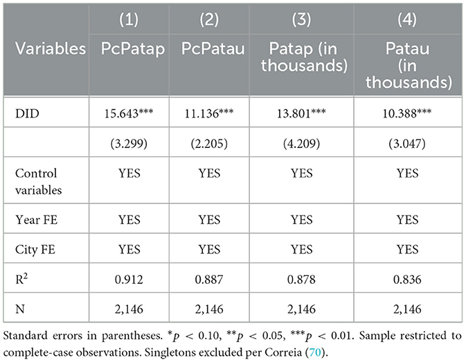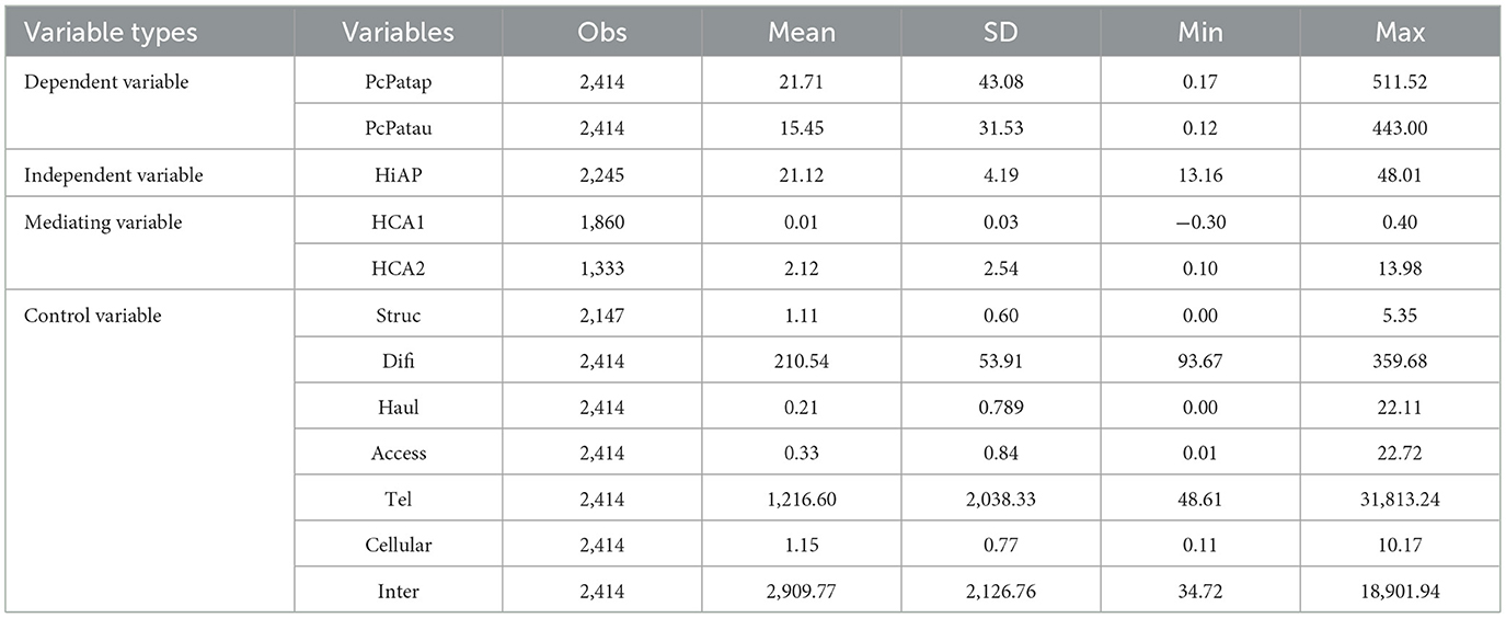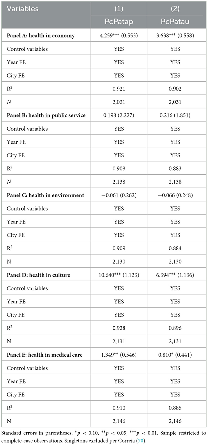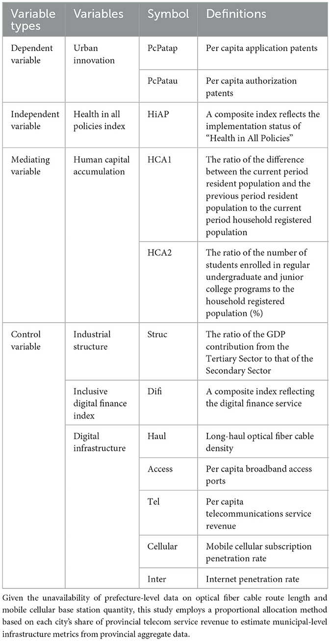 Drawing on previous studies on urban innovation, the control variables include industrial structure, digital finance, long-haul optical fiber cable density, broadband access ports, telecommunications service revenue, mobile cellular subscription penetration rate, and internet penetration rate (13, 36, 37). These city-level variables have been shown to affect urban innovation. Thus, using them as control variables provides a more accurate explanation for the effect of Health in All Policies. Table 3 provides the definitions and explanations of all variables.