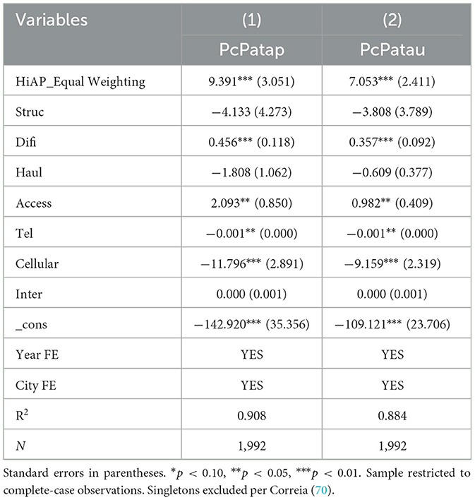 In Equations 11, 12, i and t represent province and year. β0 is the constant term, β1 to β8 are the regression estimation coefficients of each variable. PcPatapit and PcPatauit, respectively represent application patents and authorization patents, reflecting the knowledge innovation and product innovation of a city in China. HiAPit represents the level of Health in All Policies, which is the independent variable of this study. Control variables include industrial structure, digital finance, long-haul optical fiber cable density, broadband access ports, telecommunications service revenue, mobile cellular subscription penetration rate, and internet penetration rate. εit is the random error term.