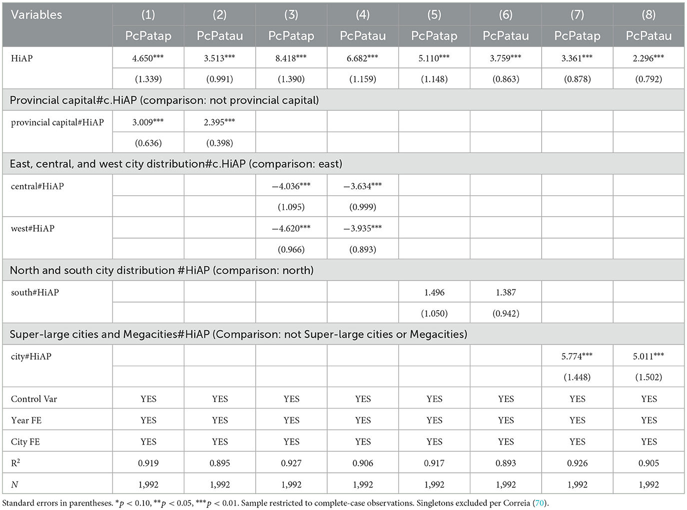 One of the reasons for the inconsistent effects of HiAP on urban innovation is heterogeneity. Specifically, there may be differences in urban innovation capacity among cities with different population sizes, administrative levels, and geographical locations. Firstly, larger cities tend to have greater human capital accumulation, enhancing the potential for HiAP to drive innovation. Additionally, densely populated areas benefit from economies of scale, attracting high-tech talent and resources, which smaller cities struggle to replicate due to resource dispersion (19). Secondly, the influence of HiAP on urban innovation varies across administrative hierarchies. Cities at higher administrative levels leverage their statutory authority and fiscal capabilities to implement the policy effectively (20). Thirdly, geographical location plays a crucial role in shaping policy outcomes. Regional disparities impact the efficacy of HiAP in fostering urban innovation. Coastal eastern regions with advanced economic structures and global integration demonstrate heightened policy effectiveness. Furthermore, the contrasting economic landscapes between southern and northern cities result in divergent impacts of HiAP on urban innovation (21). The influence of HiAP on urban innovation displays variations based on factors such as population size, administrative hierarchy of cities, and geographical positioning.