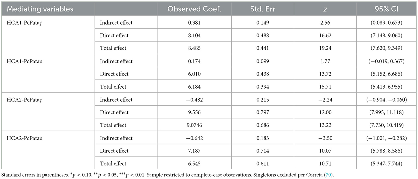 To test the mediating effect, we use the stepwise regression analysis method. First, we conduct the regression between HiAP and urban innovation to determine whether the coefficient of HiAP is significant. Second, the regressions of HiAP and population mobility (HCA1), and HiAP and talent stock (HCA2) are conducted to observe whether the coefficient of HiAP is significant. In Equations 13, 14, we conduct the regression of urban innovation, population mobility, and HiAP. In Equations 15, 16, we also conduct the regression of urban innovation, talent stock, and HiAP.