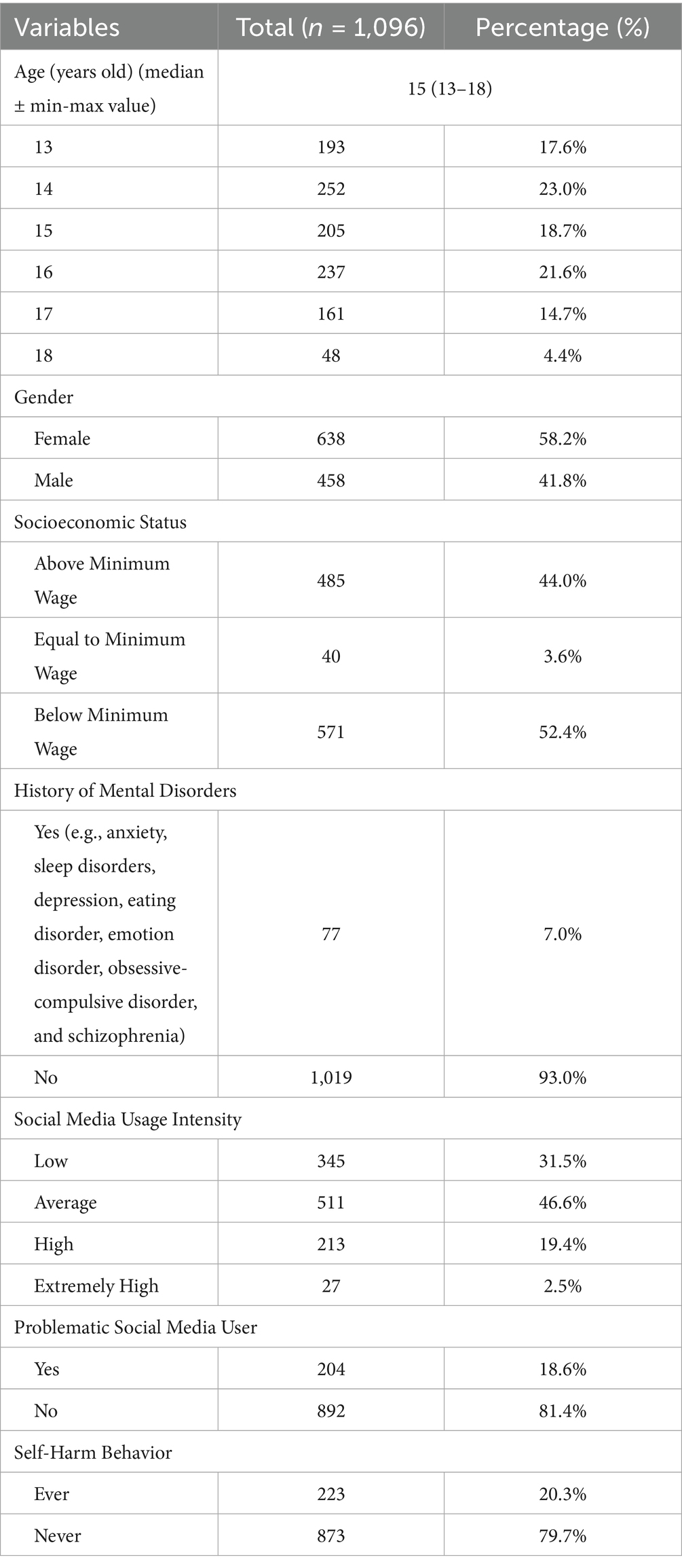 A total of 1,096 eligible adolescents completed the questionnaire. The median age of respondents was 15 years (range 13–18). Most of the respondents were female (58.2%) The sample socioeconomic status was diverse, with those below minimum wage making up the largest percentage of respondents (52.4%). Most of the respondents do not have any history of mental disorders (93.0%). The history of mental disorders reported by 77 respondents (7.0%) varied and included conditions such as anxiety, sleep disorders, depression, eating disorders, emotion disorders, etc. The subject characteristics can be seen in Table 1.