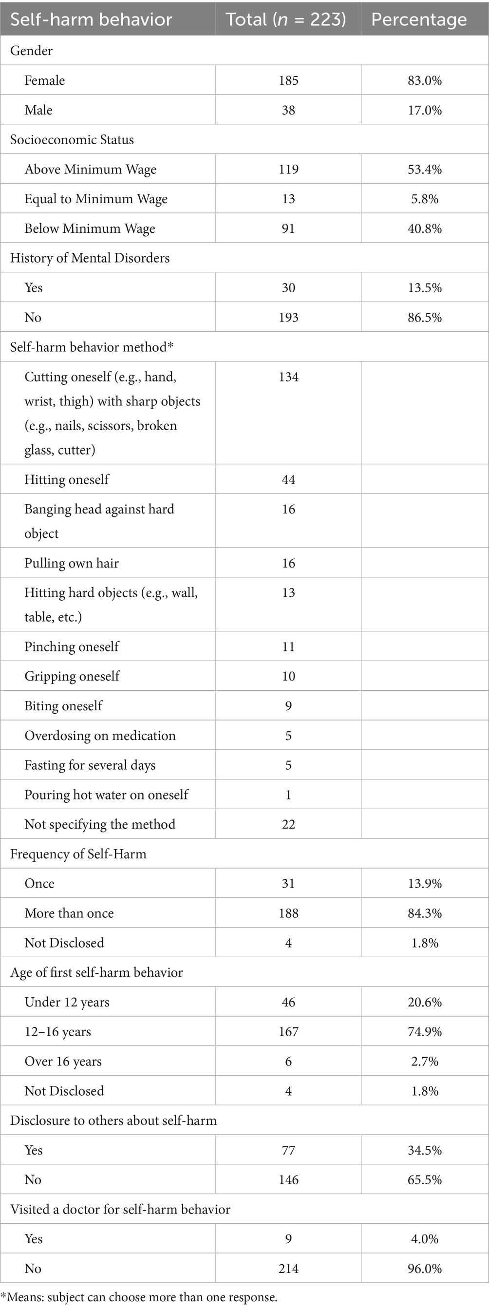 A total of 223 (20.3%) adolescents reported having engaged in self-harm at least once in their life (Table 1). Follow-up questions regarding the characteristics of self-harm behavior were only answered by these 223 respondents (Table 2). From the demographic data, most of the respondents who engaged in self-harm are female, with a proportion of 83.0%. Most of the respondents, who have engaged in self-harm had socioeconomic status above the minimum wage (53.4%). The methods of self-harm that respondents used varied and included cutting themselves with sharp objects, hitting themselves, banging their heads against hard objects, pulling their own hair, hitting hard objects, pinching them-selves, gripping themselves, biting themselves, overdosing on medication, fasting for several days, and pouring hot water on themselves. Some of them also disclosed their specific method of self-harm. The most common method was cutting themselves on the wrist, thigh, and hand with sharp objects such as scissors, glass, and nails, which 135 (60.5%) respondents reported doing.