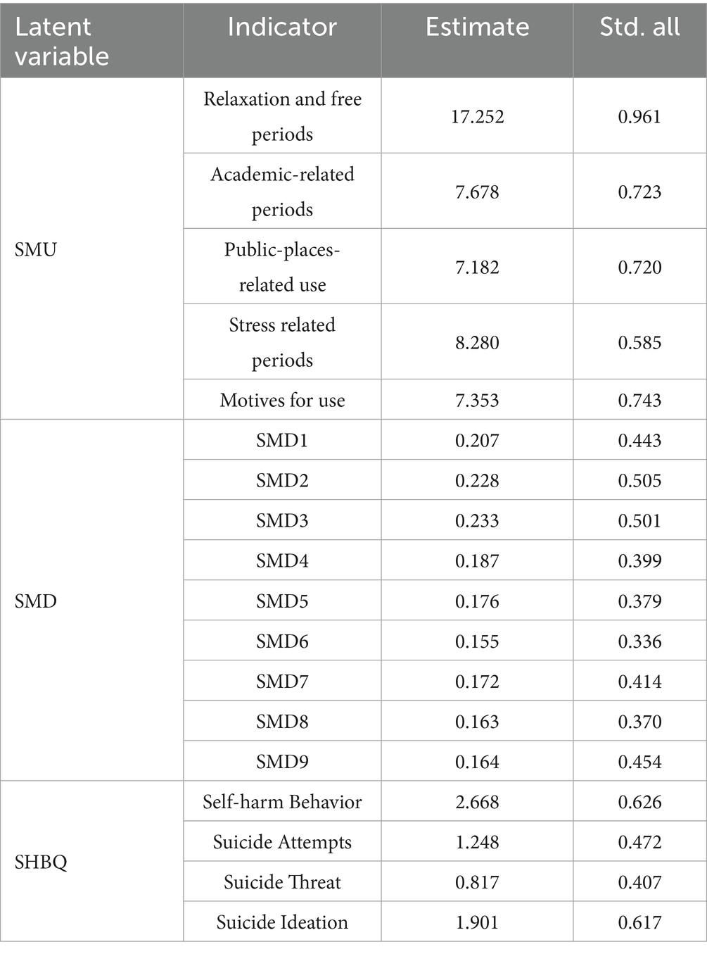 Descriptive statistical analysis was performed using the Statistical Package for the Social Sciences (SPSS) on demographic data, social media usage intensity, problematic social media use, and self-harm behavior. The Confirmatory Factor Analysis (CFA) was conducted using the R software with the lavaan package. This method was chosen for its robust capabilities in psychometric validation and flexibility in modeling latent constructs. Model fit was assessed using several commonly reported goodness-of-fit indices, consistent with standards in psychometrics literature: