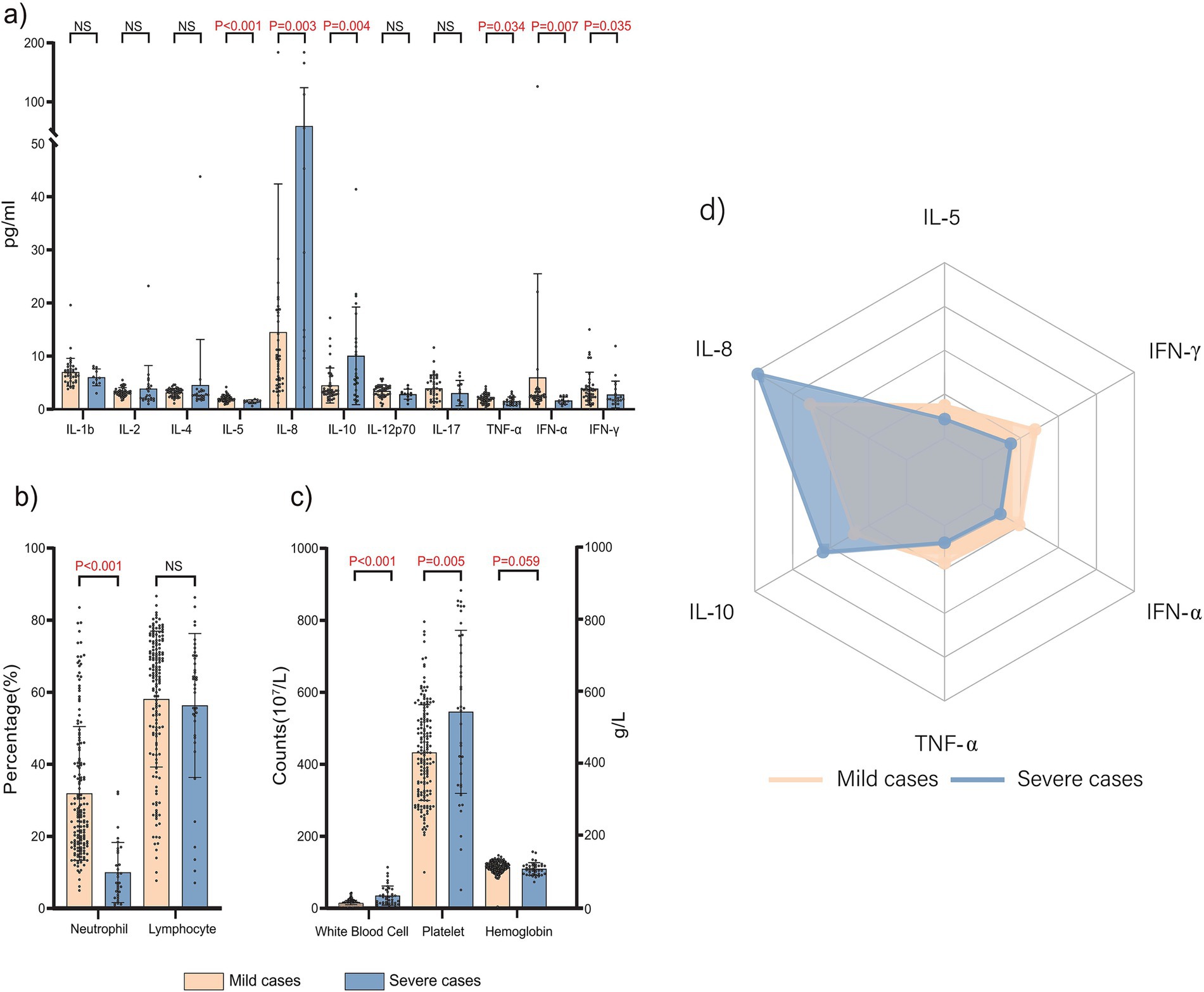 In this study, 115 patients (58.37%) showed varying degrees of elevated WBC counts, with 24 (12.18%) having a WBC of >30 × 109/L. Comparisons of laboratory data between the two groups revealed that the severe cases group had significantly higher interleukin (IL)-8 and IL-10 levels (Figures 1a–1d), WBC counts, and platelet counts (Figure 1c) than the mild cases group (p < 0.05). Conversely, the severe cases group exhibited significantly lower levels of IL-5, tumor necrosis factor (TNF)-α, interferon (IFN)-α, IFN-γ, and neutrophil percentage (Figure 1b), than the mild cases group (p < 0.05).