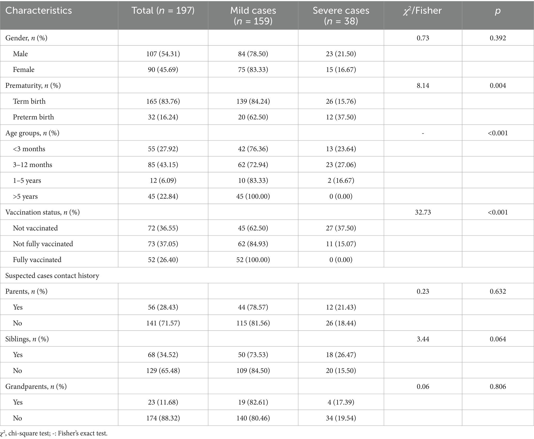 The distribution of the severe and mild cases groups by sex, prematurity, age, vaccination status, and contact history with suspected cases is shown in Table 1.