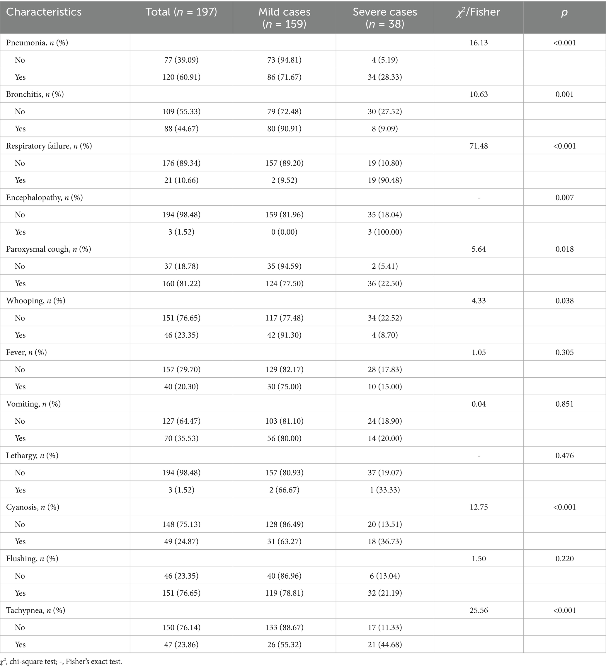 If pertussis is not promptly diagnosed or is misdiagnosed in its early stages, it can easily progress to severe pertussis, which is associated with a higher case-fatality rate. Severe pertussis primarily affects infants and young children and is often accompanied by severe complications such as respiratory failure, encephalopathy, and pulmonary hypertension—significant causes of mortality in this age group (9). According to a global pertussis disease burden model, in 2017, there were 85,900 pertussis-related deaths among children under 1 year old globally, accounting for 53% of deaths in children under 5 years of age (10). Identifying the risk factors for severe pertussis and examining the clinical characteristics of patients with varying disease severity are essential for improving the prognosis of severe pertussis.