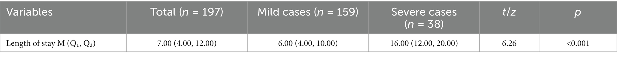 Regarding antibiotic treatment, 56 patients (28.43%) received cefuroxime, 30 (15.23%) received amoxicillin, 18 (9.14%) received erythromycin, 130 (65.99%) received piperacillin, and 65 (32.99%) received sulfamethoxazole. A comparison of antibiotic treatments revealed that the severe cases group had longer durations of antibiotic treatment and higher usage rates of cephalosporins and amoxicillin than the mild cases group, with statistically significant differences (p < 0.05).