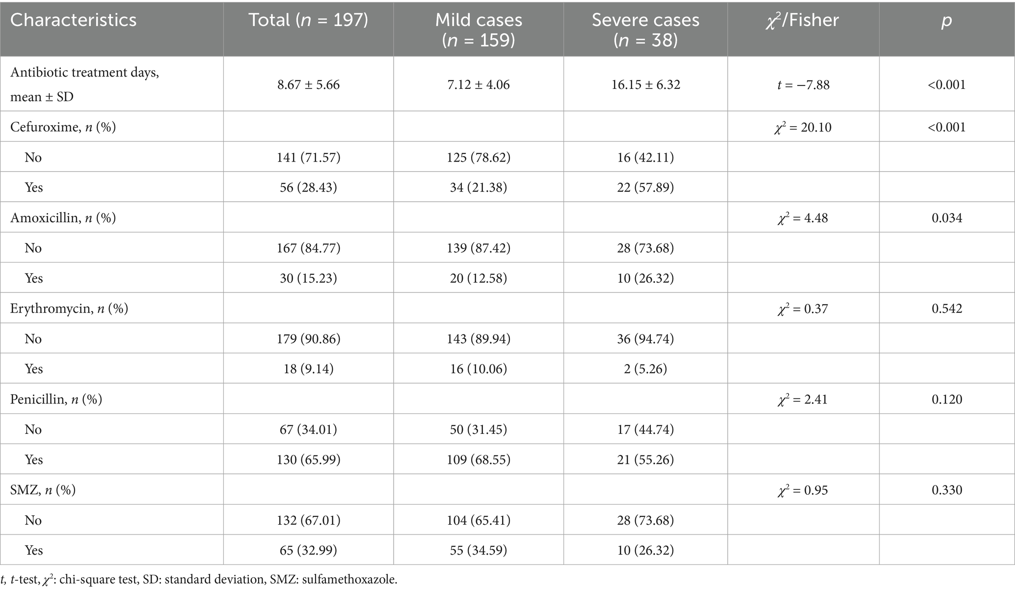 The distribution of antibiotic treatments between the severe and mild cases groups is detailed in Table 4.