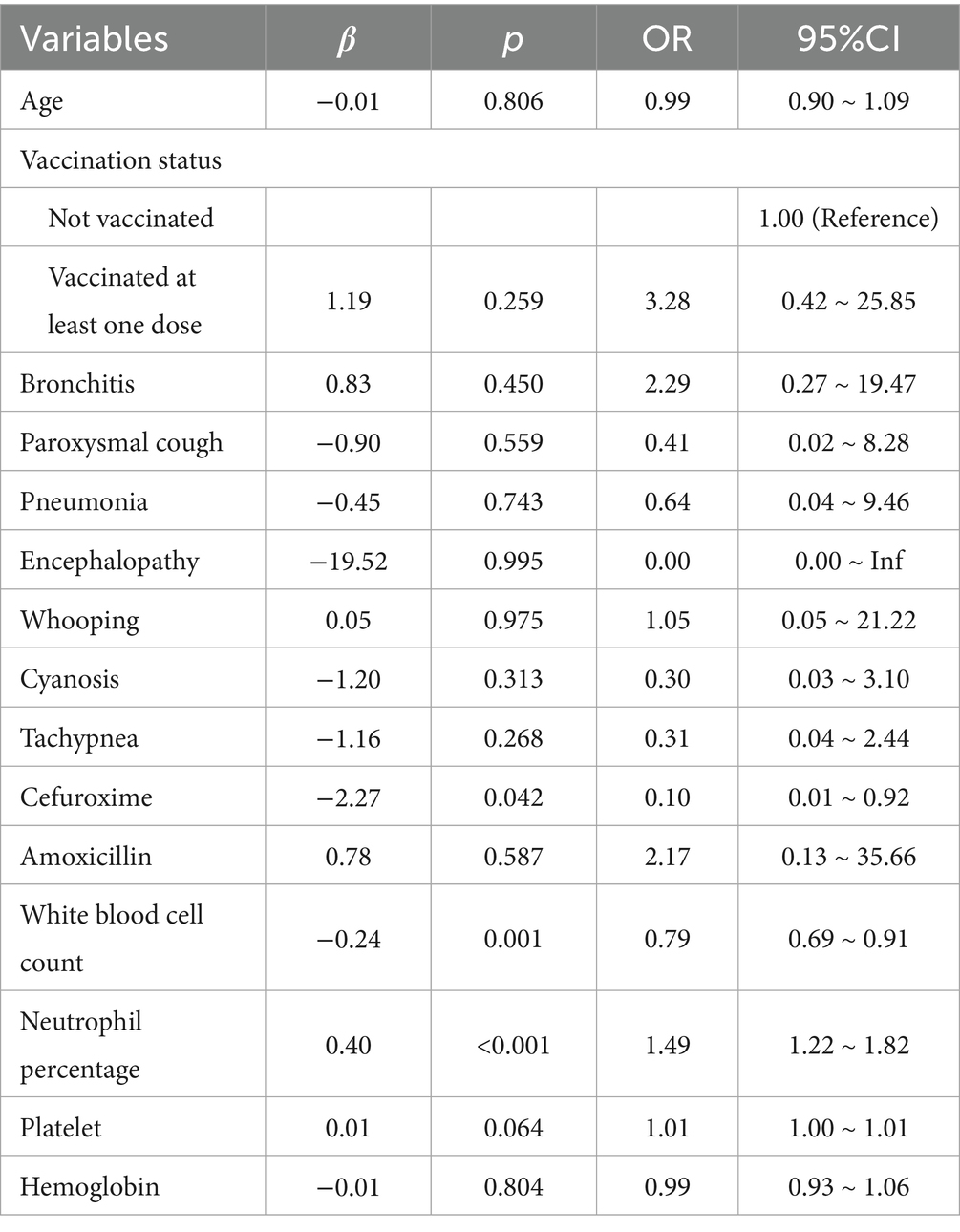 Results: Among the 197 hospitalized children, those born prematurely or younger than 3 months were more likely to be admitted to the pediatric intensive care unit (PICU). All patients admitted to the PICU were infants who were either unvaccinated or incompletely vaccinated against pertussis. The most common clinical symptoms among hospitalized children were pneumonia, paroxysmal cough, and flushing. The severe cases group exhibited significantly higher levels than the mild cases group in length of stay, duration of antibiotic treatment, white blood cell (WBC) count, pneumonia, respiratory failure, and tachypnea (p < 0.05). Multivariate logistic regression analysis identified cefuroxime usage [odds ratio (OR) = 0.10, 95% confidence interval (CI) = 0.01–0.92], high WBC count (OR = 0.79, 95% CI = 0.69–0.91), and high neutrophil percentage (OR = 1.49, 95% CI = 1.22–1.82) as independent risk factors for PICU admission (p < 0.05).