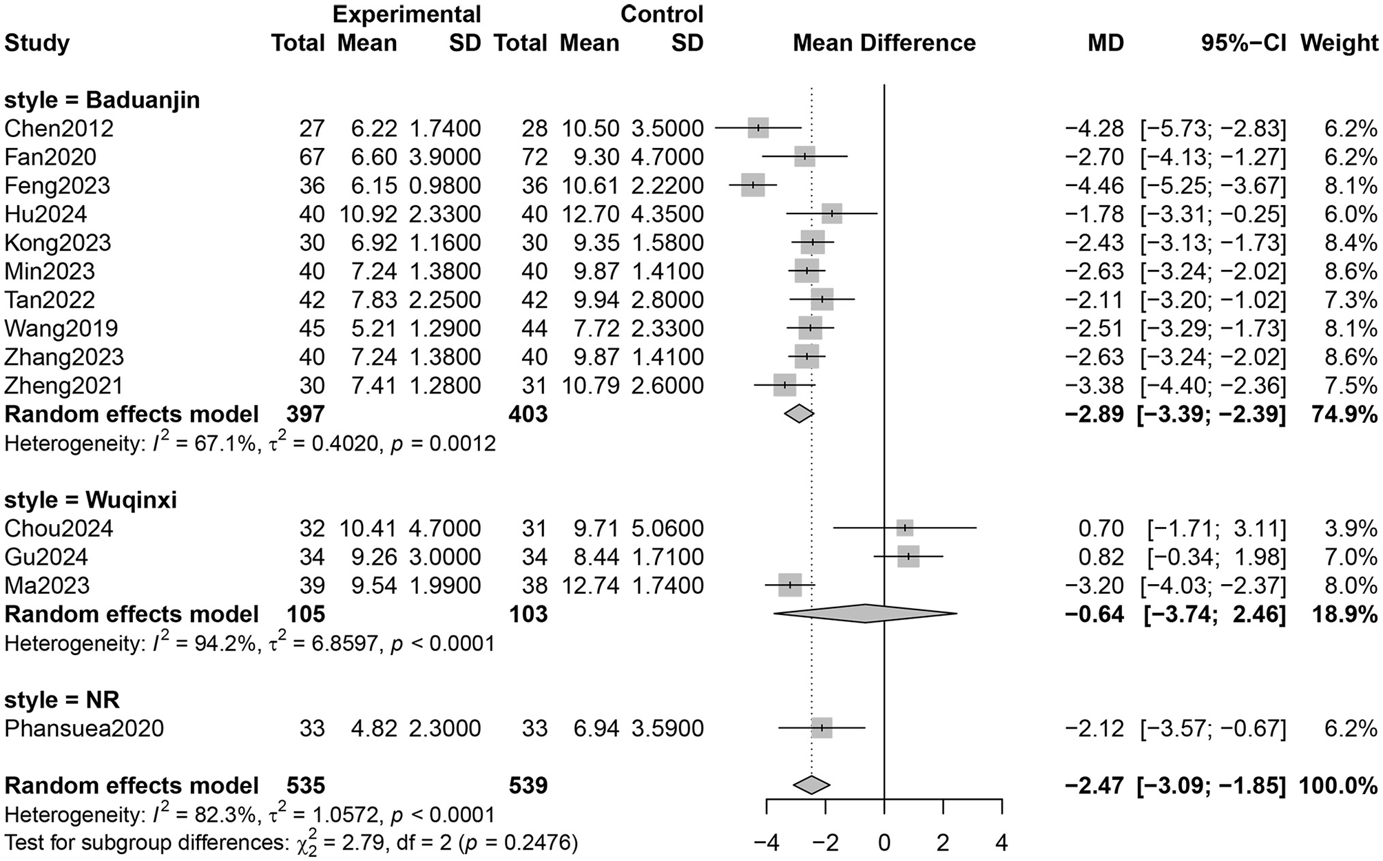 ![Forest plot displaying mean differences between experimental and control groups across 14 studies from 2012 to 2024. Each study is represented by a square with a horizontal line indicating the confidence interval. The pooled mean difference is -2.47 with a 95% confidence interval of [-3.09, -1.85], shown as a diamond. Heterogeneity is at 82.3% with significance p < 0.0001.](https://www.frontiersin.org/files/Articles/1664055/xml-images/fpubh-13-1664055-g0004.webp)