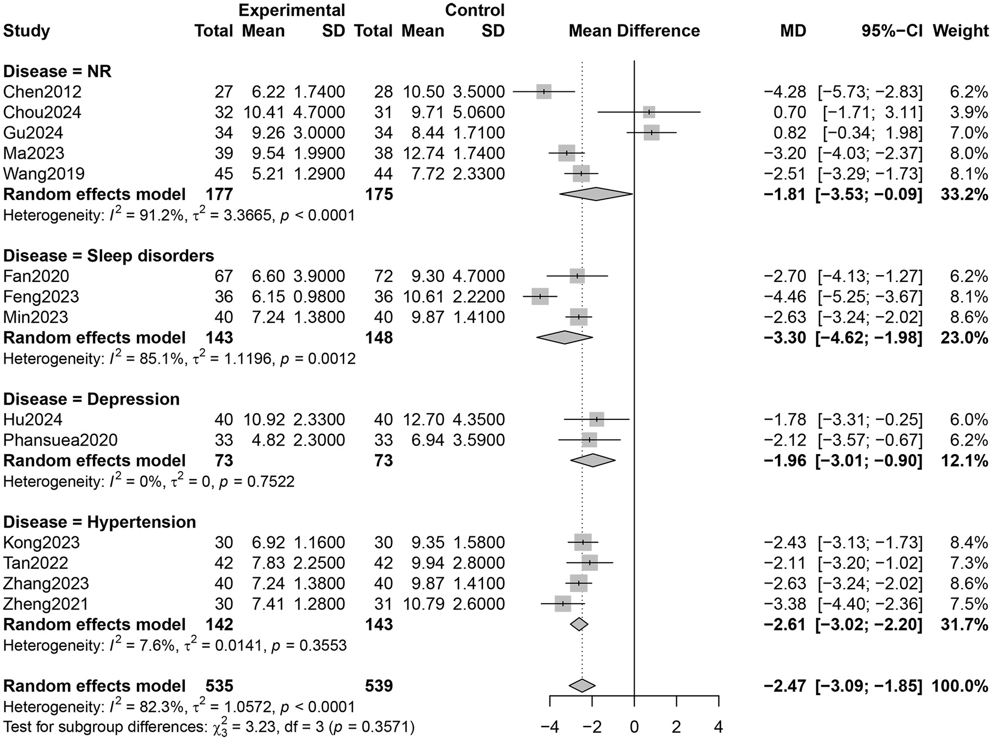 ![Forest plot showing meta-analysis of different diseases: NR, sleep disorders, depression, and hypertension. Each section displays multiple studies with mean differences (MD), confidence intervals (CI), and weights. Random effects model is applied, indicating heterogeneity for each disease. The overall mean difference across all studies is -2.47 with a confidence interval of [-3.09; -1.85].](https://www.frontiersin.org/files/Articles/1664055/xml-images/fpubh-13-1664055-g0006.webp)