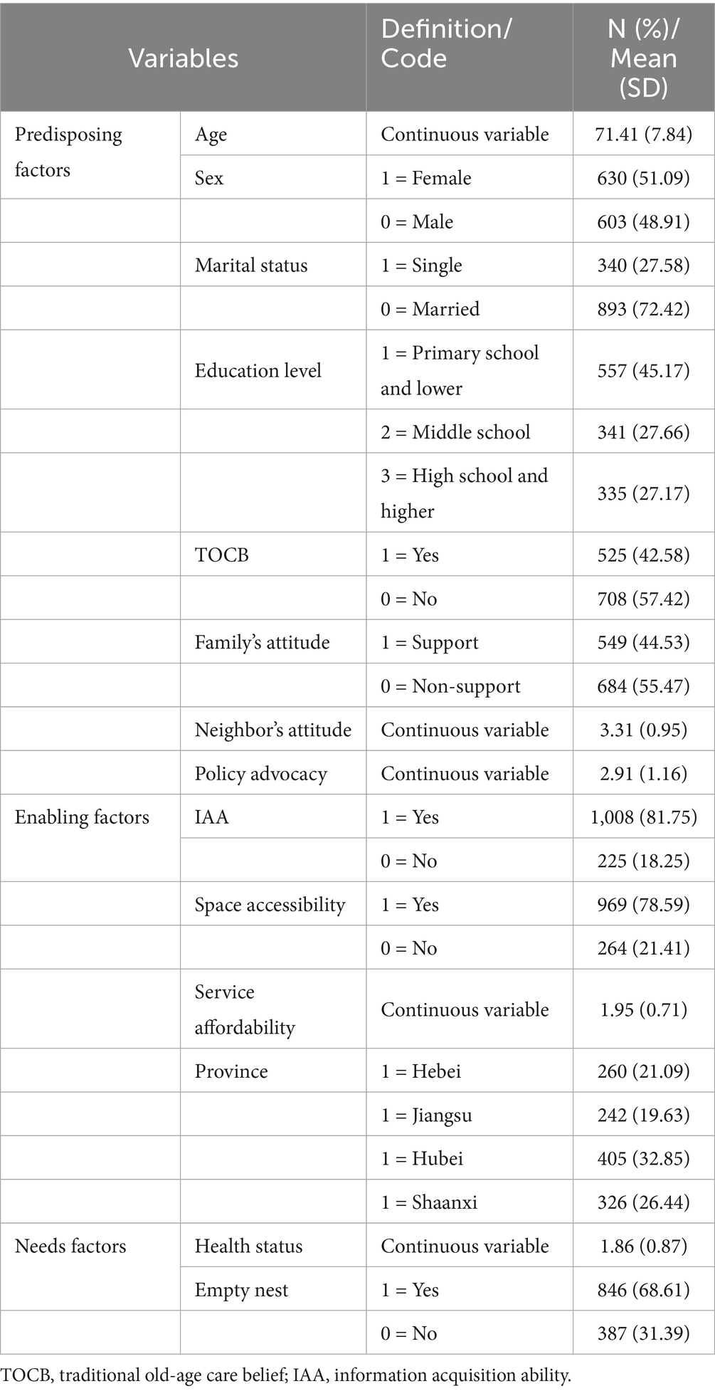 Following the conceptual framework proposed above, three sets of potential influencing factors were identified. Predisposing factors include demographic and socioeconomic characteristics, traditional older adults care beliefs, and perceived social norms. Demographic characteristics were measured by age, sex, marital status, and education level. Traditional old-age care belief (TOCB) may affect an individual’s attitude to use CCSs, which was measured by the question “Do you agree with the concept of raising children for old age,” with 1 for “Yes” and 0 for “No.” Perceived social norms include three variables of “family’s attitude,” “neighbor’s attitude,” and “policy advocacy.” Family’s attitude was measured by the item “My family members support me to use CCSs,” with 1 for “Support” and 0 for “Non-support.” Neighbors’ attitude and policy advocacy were measured by items “Older people around me often use CCSs” and “I often hear the policy advocacy about CCSs,” rated on a five-point Likert scale from very disagree = 1 to very agree = 5.