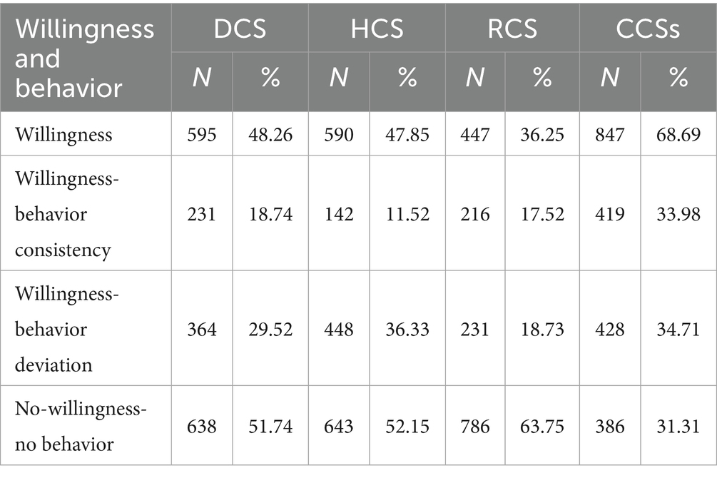 In terms of the specific CCS category, the willingness of older adults to use CCSs showed a significant decrease. Participants having a willingness to use DCS, HCS, and RCS were 48.26, 47.85, and 36.25%, respectively. This illustrates that participants might show different willingness-behavior transformation status when using different CCS categories. Specifically, participants showing willingness - behavior deviation of using DCS, HCS, and RCS were 29.52, 36.33 and 18.73%, while participants showing willingness - behavior consistency were only 18.74, 11.52 and 17.52%, respectively, indicating the large gaps between high willingness and low behavior of older adults to use CCSs.