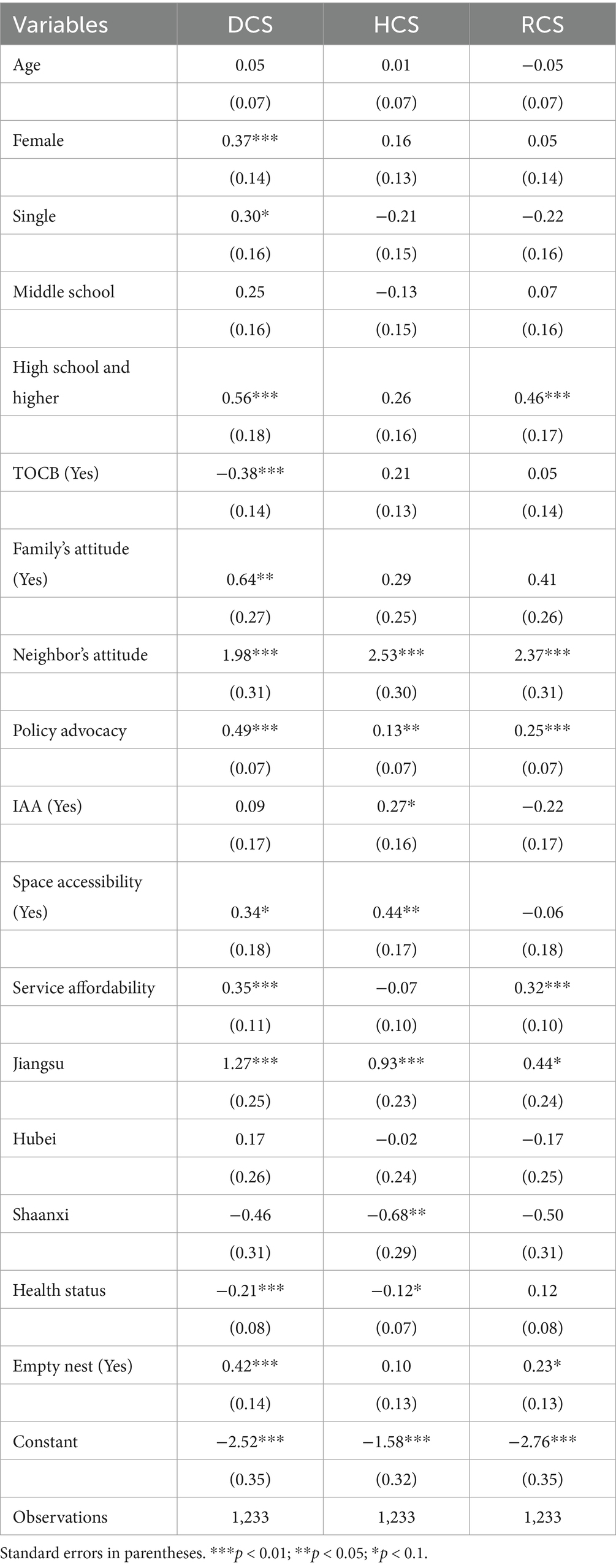 The binary logistics regression estimation was conducted to identify factors affecting the willingness of older adults to use DCS, HCS, and RCS. As shown in Table 3, except for age, all predisposing factors, enabling factors, and need factors had significant, albeit selective, effects on willingness to use CCS categories.